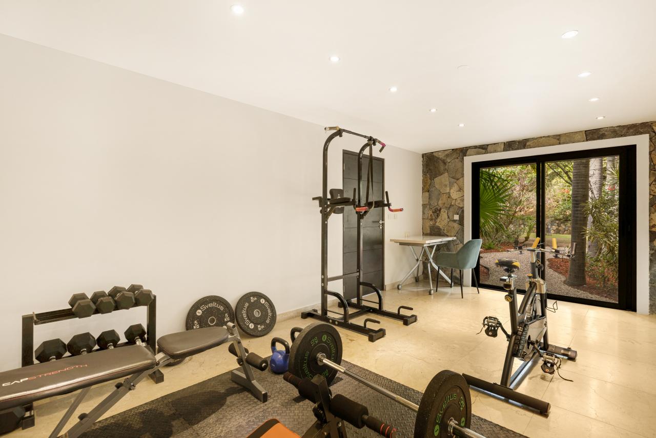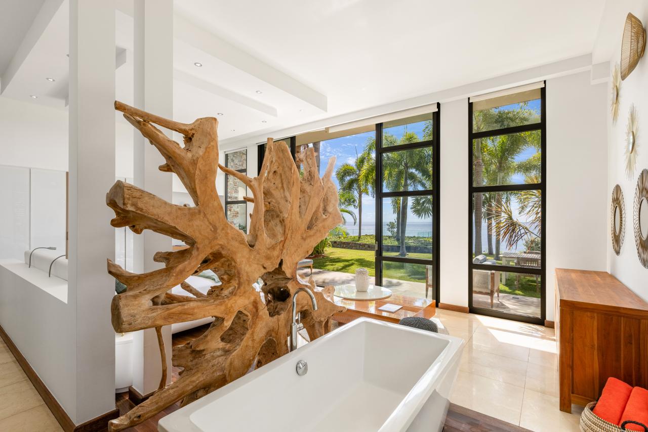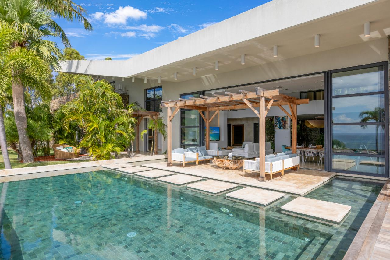 The first three bedrooms are located on the main level, including the master suite, which opens directly onto the tropical garden, offering a refreshing and exotic start to each morning. One of the other two rooms features two large bunk beds, providing the ideal setup for children and close proximity to the master bedroom.