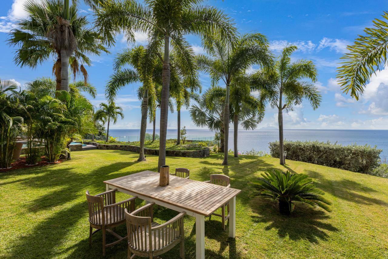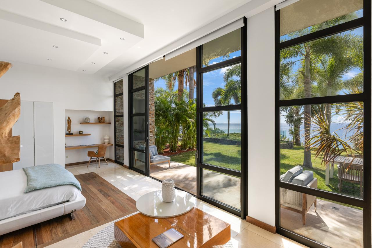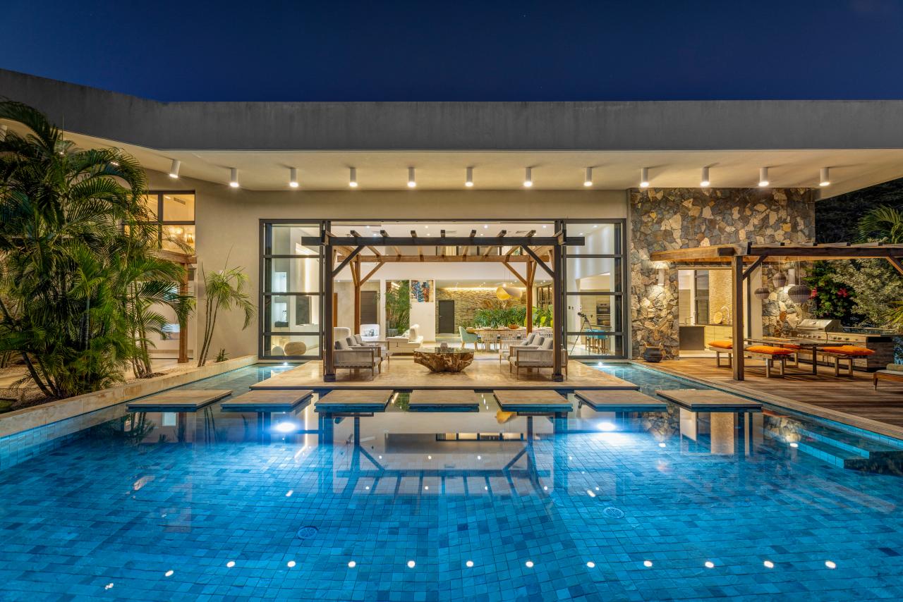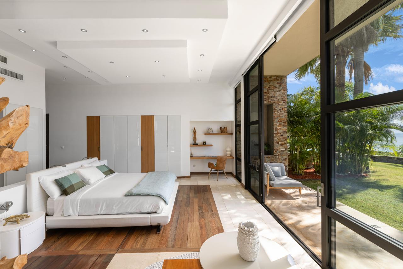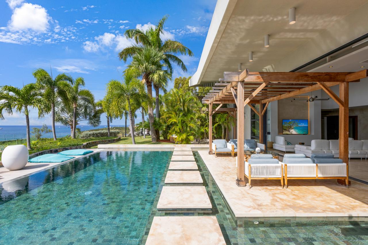 The villa has gorgeous outdoor spaces to enjoy the Caribbean tropical climate. A large shaded living space just steps from both the pool and the inside provides the perfect place to relax any time of the day. The beautiful infinity pool includes built in steps from the outdoor living room to the dining space. Another terrace features daybeds for a sunny spot to lounge by the pool and enjoy the views. At the end of the day, the villa is the perfect place to enjoy a bright and colorful sunset. Have a drink, get comfortable and enjoy the breathtaking view.