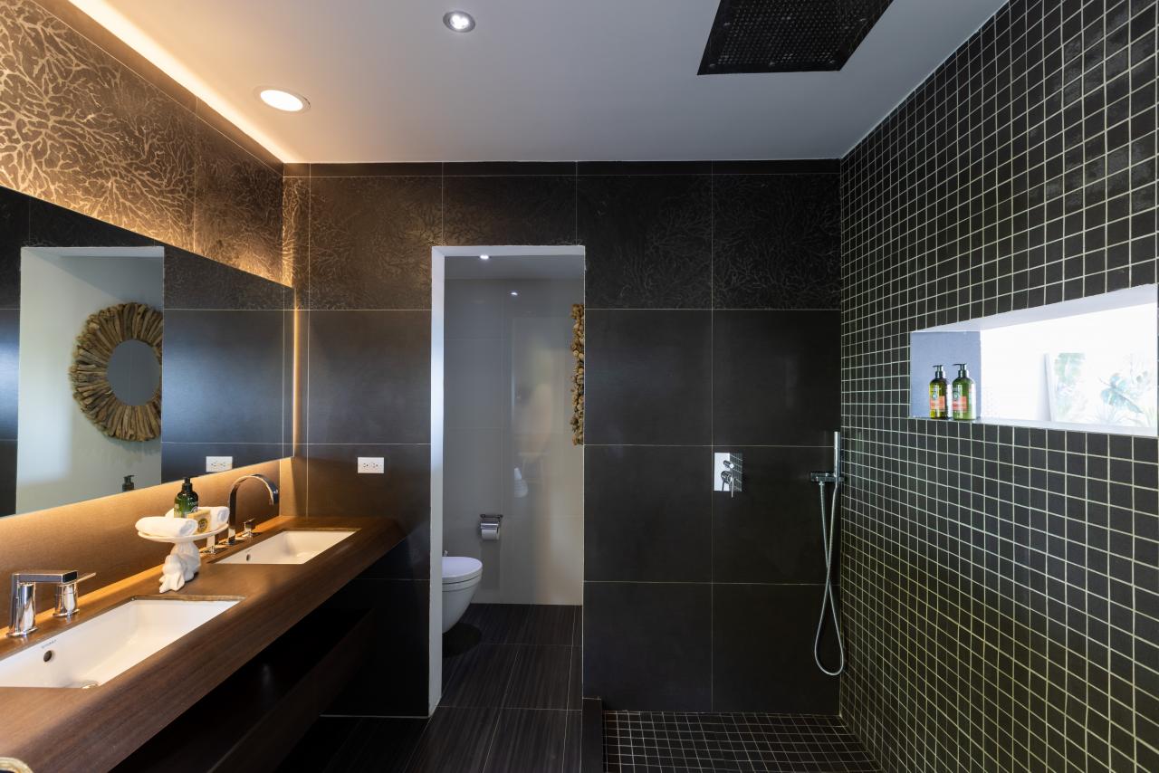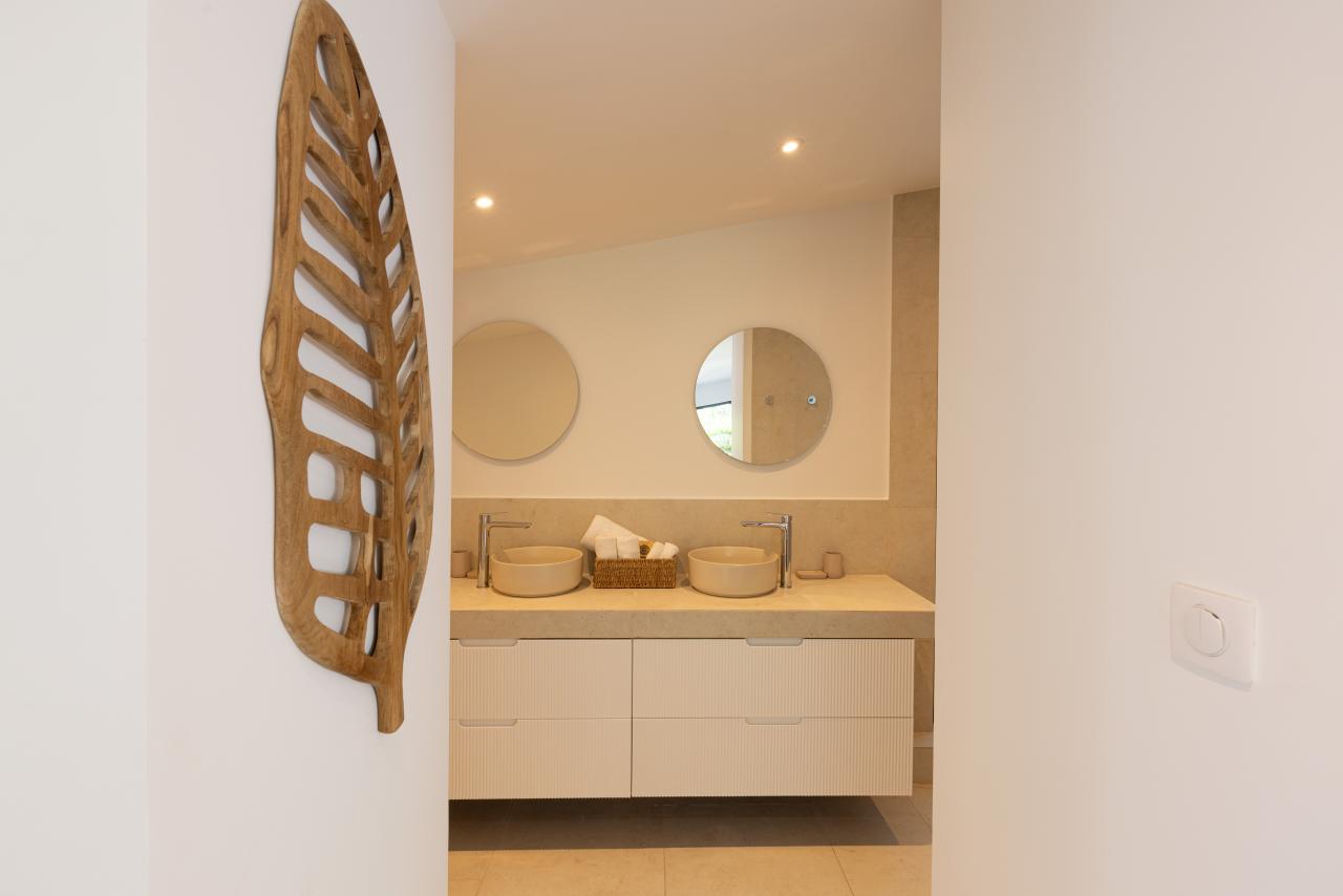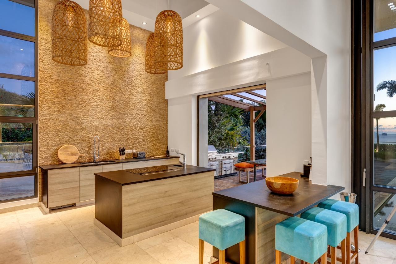 Find the magic of Emeraude upon entering, when you discover several indoor ponds filled with beautiful colorful fish creating a decorative and soothing water garden. This amazing entrance leads to a beautiful interior living space with high ceilings facing the swimming pool and the azur sea. An elegant yet comfortable living room blends with the outdoor ocean colours while the large solid wood dining table joins the space to the fully equipped kitchen with all the latest appliances. Special to the kitchen is the hidden pantry. Meals can also be taken outside around the beautiful table near the pool.