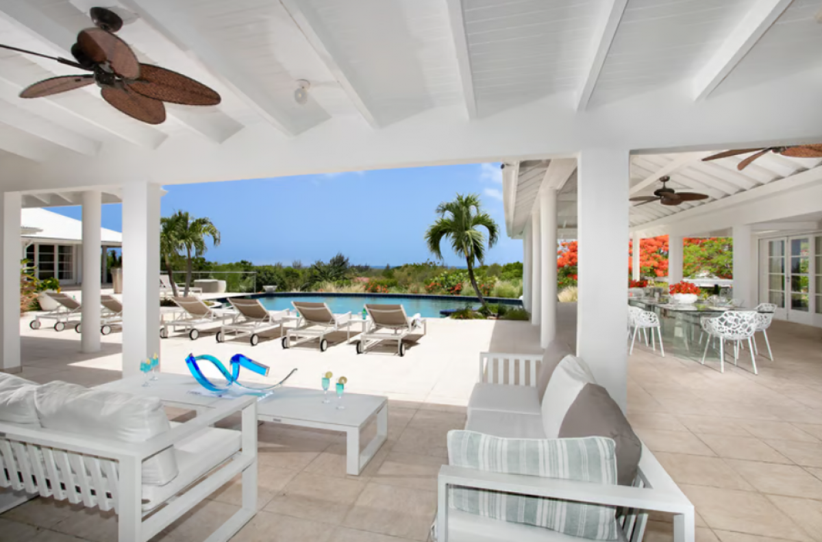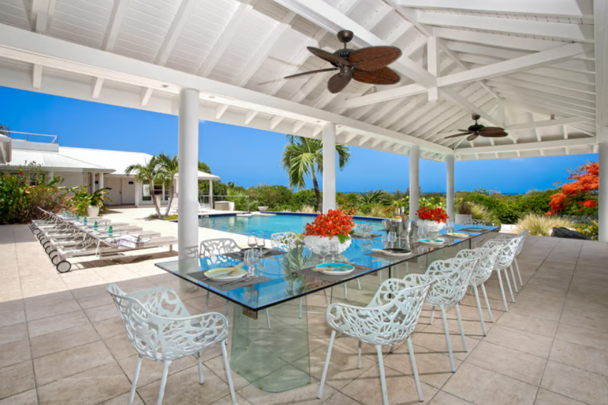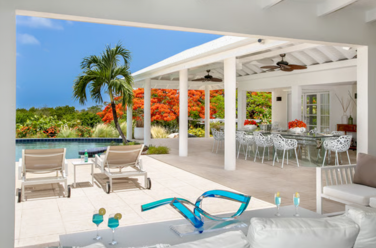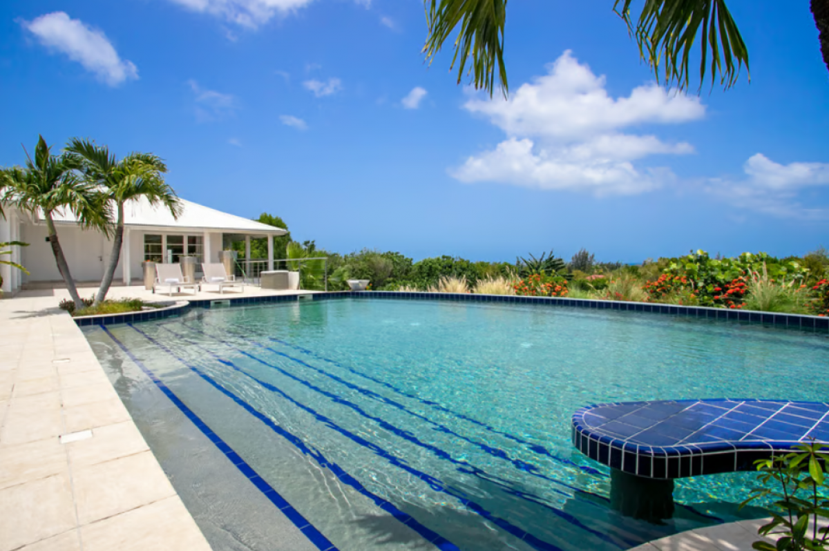 You arrive at Encore along a long, inviting drive filled with palms, exotic tropical flowers, trees and shrubs. Beautiful gardens fill the entry courtyard and completely surround the villa. The Moorish inspired soaring arched entrance showcases the glimpse of brilliant sapphire blue Caribbean Sea and sky as you enter the cool interiors. The turquoise pool, framed by palms and flamboyant, runs the length of the terrace connecting the villa with the view.