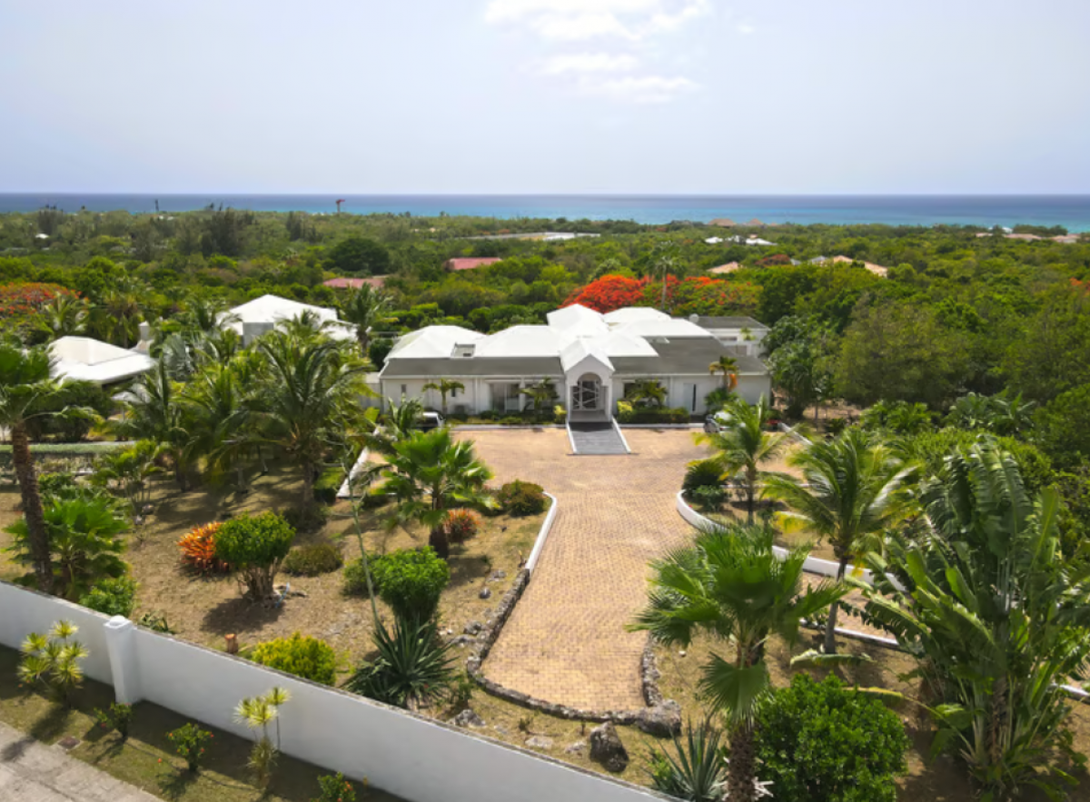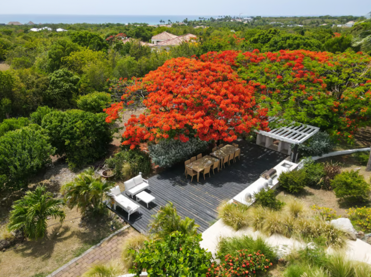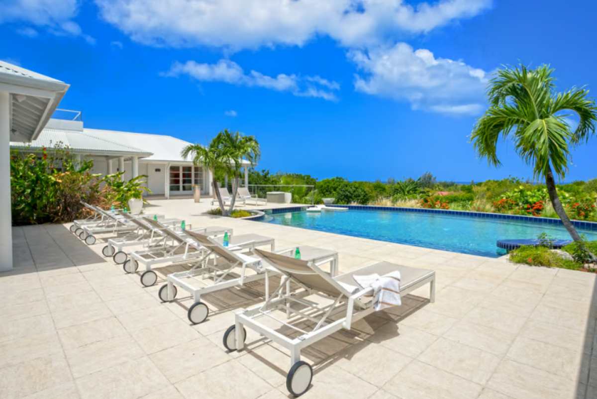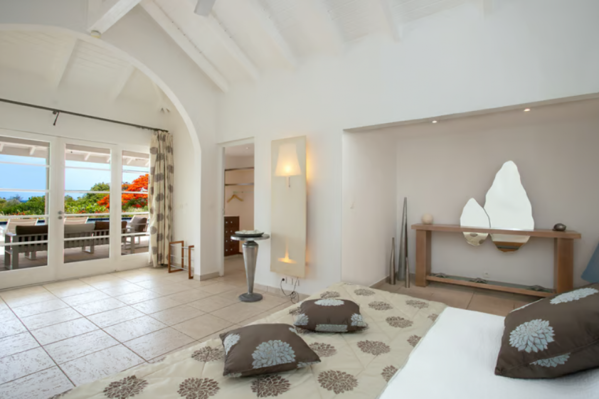 You arrive at Encore along a long, inviting drive filled with palms, exotic tropical flowers, trees and shrubs. Beautiful gardens fill the entry courtyard and completely surround the villa. The Moorish inspired soaring arched entrance showcases the glimpse of brilliant sapphire blue Caribbean Sea and sky as you enter the cool interiors. The turquoise pool, framed by palms and flamboyant, runs the length of the terrace connecting the villa with the view.