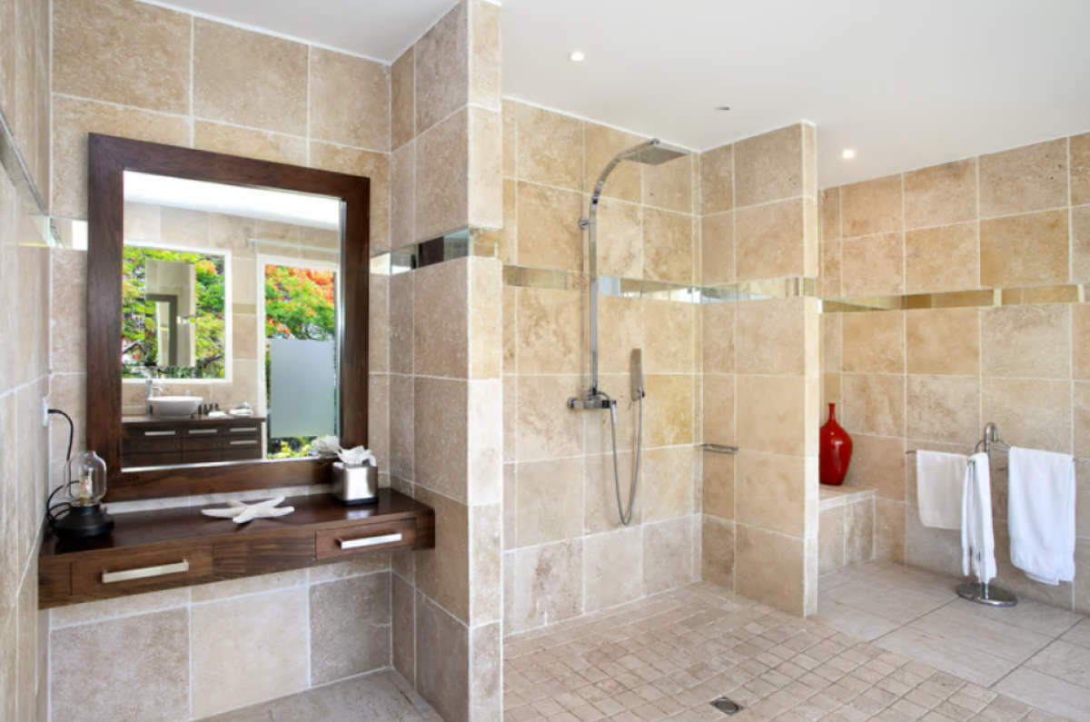 The five equal size bedrooms connect off the terrace. Each one has an incredible view. The stylish spa style bathrooms have sea views plus outdoor showers with private seating. It’s a beautiful way to connect with tropical nature. The bedroom décor mixes interesting contemporary lines and textures with exotic touches like teak poster beds, interesting art and tranquil colors. A sixth garden view bedroom is a recent addition to the property designed and decorated with the same contemporary touches of the original five bedrooms. A nicely equipped gym, with outdoor shower and sea view are just off the great room.