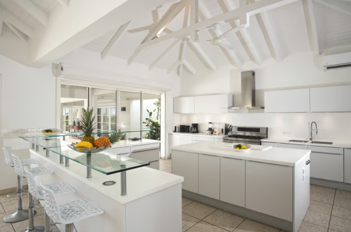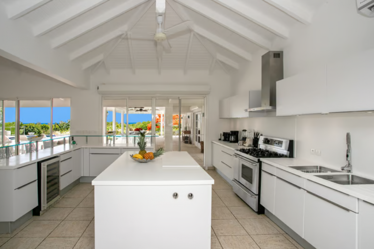 Inside the villa, the expansive spaces offer multi areas for relaxing, dining and cooking. Refined travertine tile floors harmoniously flow throughout. Floor to ceiling sliding doors open to the view and the breezes. The spacious, well-equipped kitchen is one of the largest on island, providing a perfect platform to create inspired gourmet meals. Light woods, granite and travertine are accented by stainless appliances including two professional sized refrigerators. Wrap around countertops provides spacious indoor dining overlooking the chef’s preparations and the view. The double living room is divided by color; one side a blend of neutrals and the other blending white plus color. The style mixes contemporary with a touch of exotic.