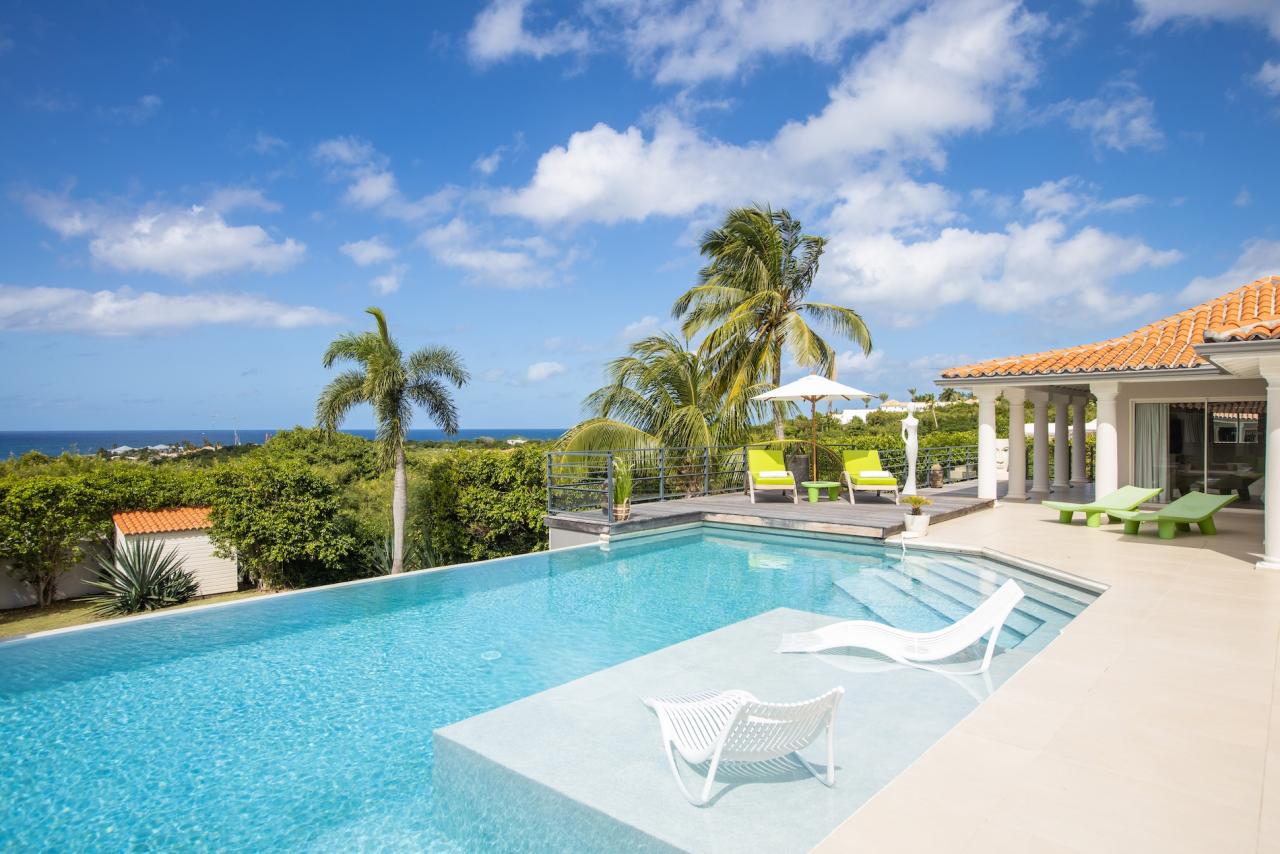 Giselle’s heated pool on the spacious terrace overlooks Plum Bay Beach and the sumptuous setting sun. This superb St Martin rental has a 180º view of the crystal blue waters of the Caribbean and is but a short 5-minute walk to the beach.