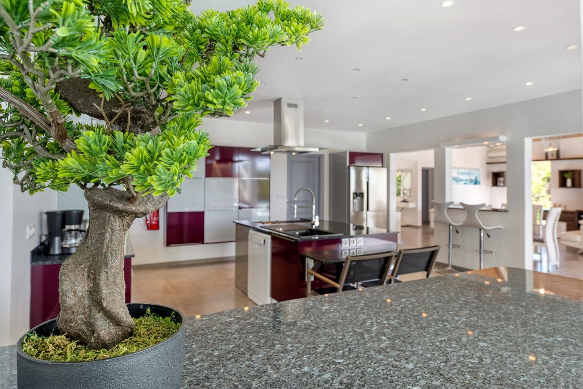 The clean modern design of the house perfectly blends the open plan interior onto the generous outdoor spaces filled with dining and lounging spaces. Travertine tiles visually connect the spaces. Elegant, inviting designer furniture, used inside and outside, has a Euro style in soothing taupe, off white and grey with touches of vibrant color. The interior spaces have ample seating for enjoying the entertainment features of the house as well as indoor dining. A well-appointed kitchen pairs beautifully with the flow of the house. In deep aubergine, steel and grey granite, the kitchen opens to both the exterior and interior spaces connecting the chef with the guests. Covered, multilevel terraces create opportunities to change the scene. On the main level is the large fiber optic pool which delights with ever changing colors at night. Or perhaps enjoy the outdoor pool table for a bit of sport. For really spectacular views, head up to the roof top living space for a spectacular perch to watch the view from sunrise to sunset. A hot tub provides a tranquil spot for detoxing from stress.