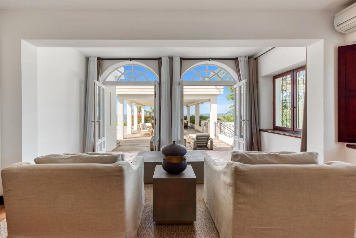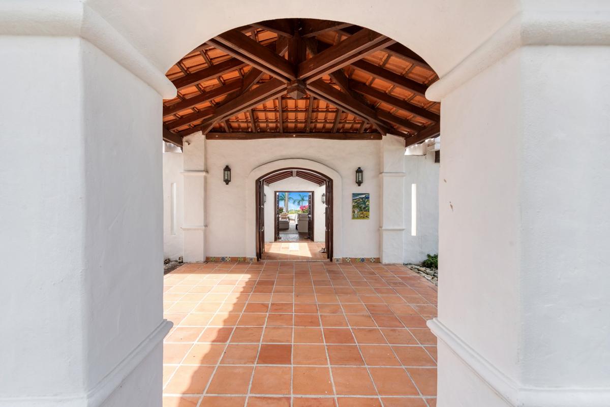 Hacienda is an elegant Spanish-Caribbean style villa designed to capture spectacular views and maximize outdoor living. The covered courtyard entrance with its Old World wooden doors, tiled floors and exotic plantings creates the perfect introduction to a stunning tropical view. Framed by royal palms and pink bougainvillea, the view is a panoramic vista filled with shades of blue from the sapphire sea to the deep blue sky; gorgeous in daytime; spectacular at sunset.