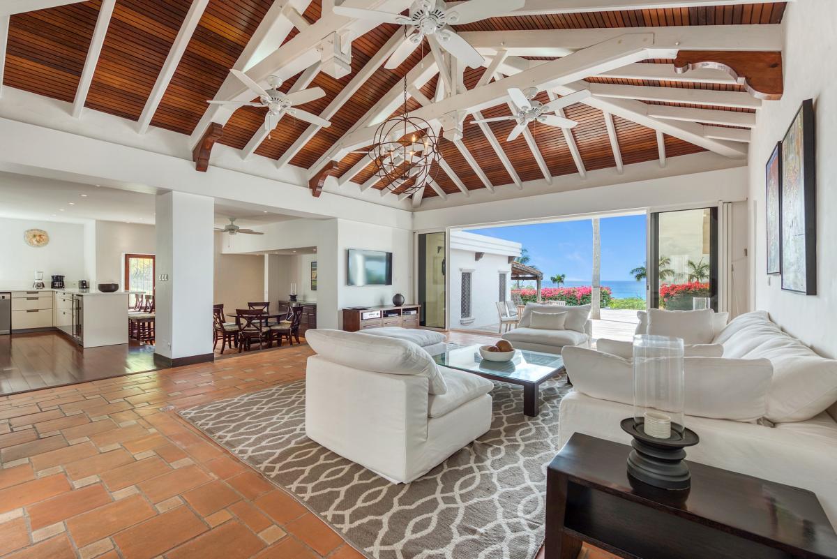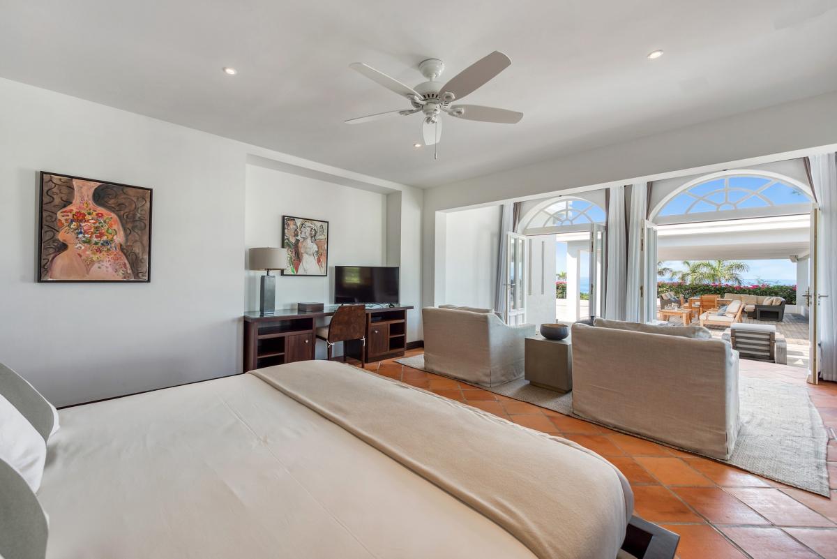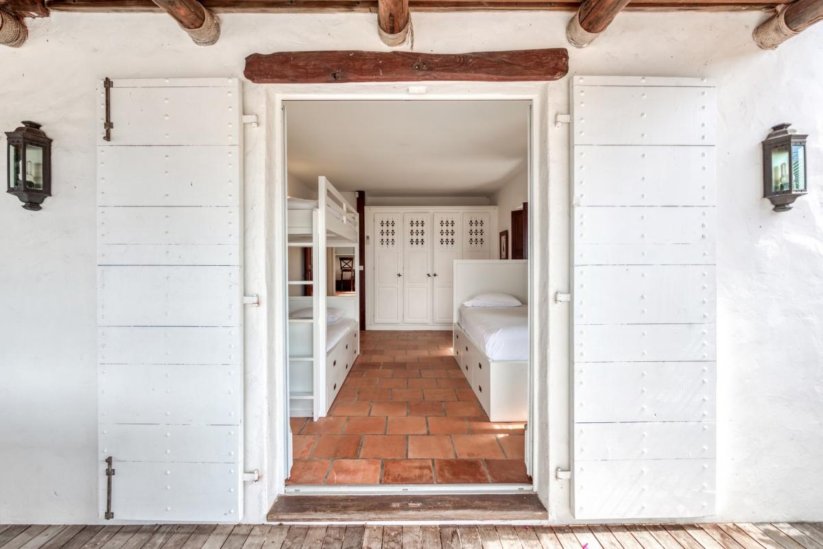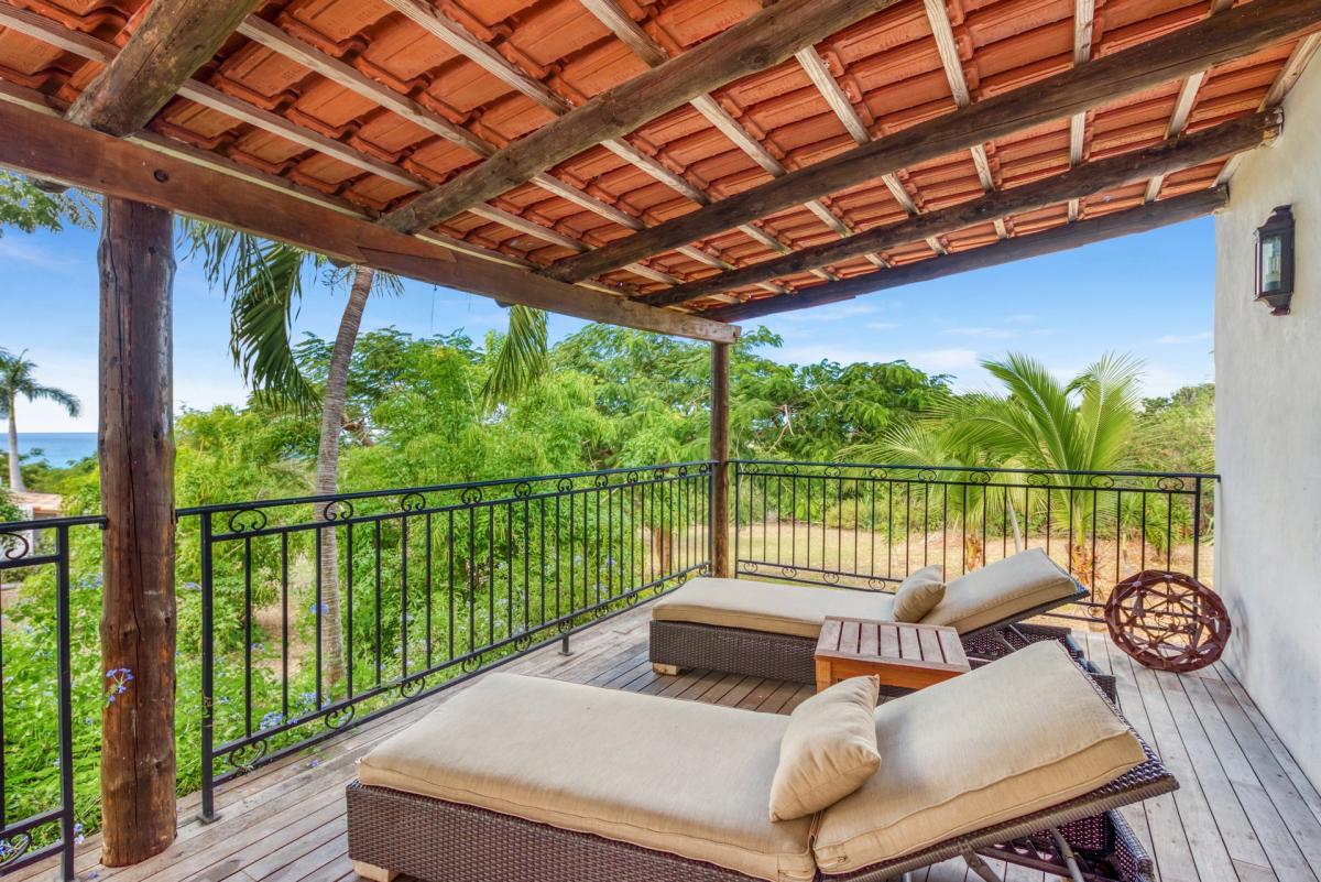 There are four bedrooms. Two are in private casitas off the upper deck. Spacious and comfortable, each room’s décor is a blend of serene whites and tans mixed with dark wood. Charming Spanish style shutters create privacy. Both casita bedrooms have sea and garden views as well as private patios. The gorgeous spa style bathrooms, with walk in showers, are designed in travertine accented with dark woods. Two additional bedrooms connect to the interior living space. It’s a wonderful set up for children. One room has bunk beds. The adjacent room has a king bed. The two share a spa style bathroom.