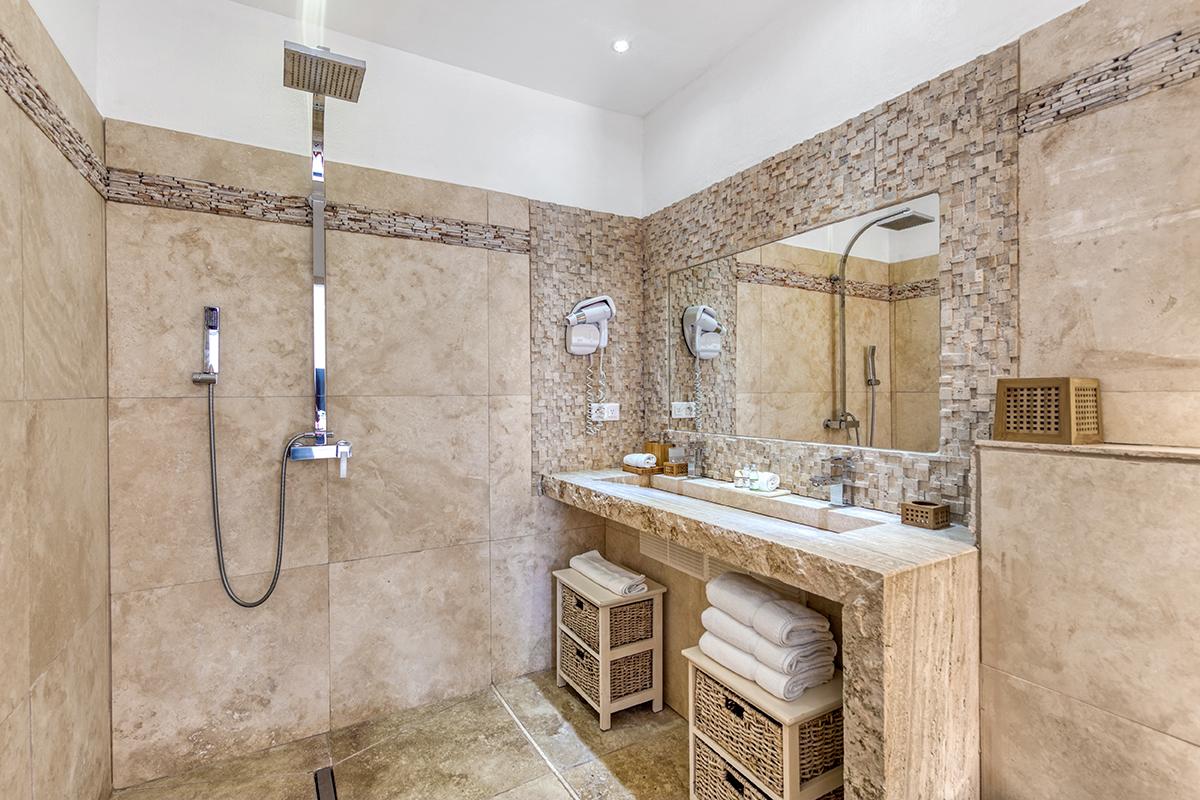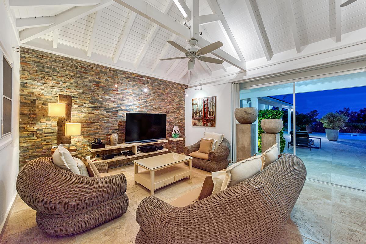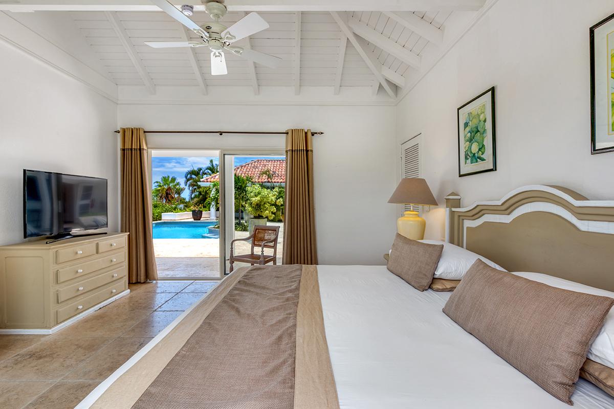 The two equal size bedrooms are set off the pool deck. The décor is fresh and contemporary with an old world Caribbean twist. Painted furnishing in taupe and cream are complimented by elegant linens in tan, cream and white and colorful artwork. The feel is cozy and elegant. The en suite spa style bathrooms are beautifully detailed in travertine tiles, sculpted sinks and walk in showers.
