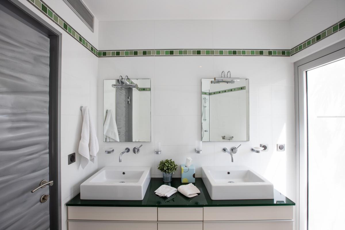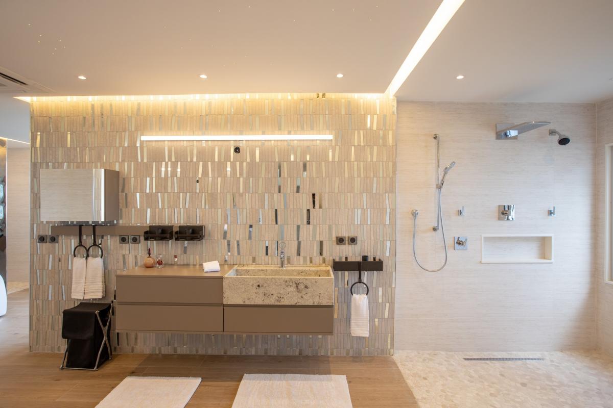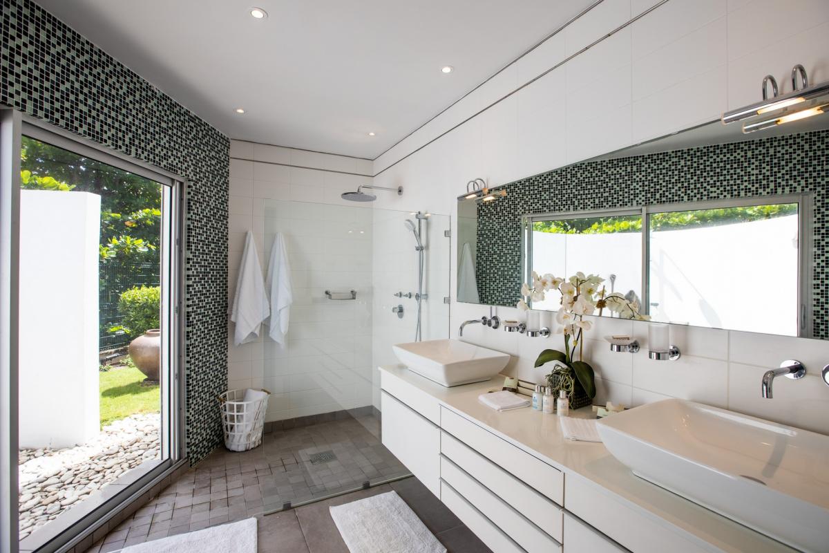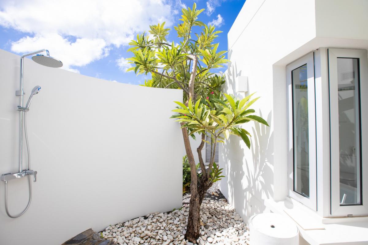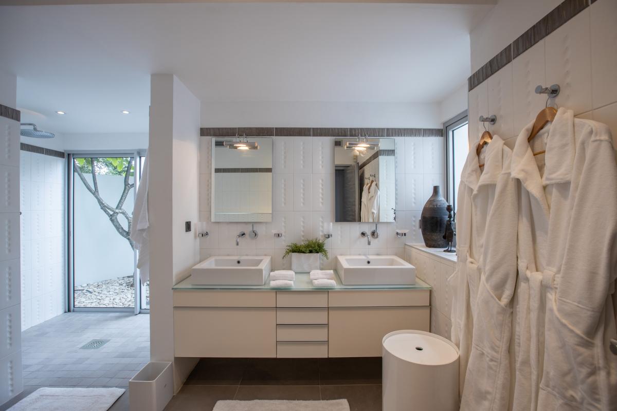 Main House : Bathrooms state of the Art fully equipped , over head and hand showers in each bathroom . Outside Showers in all Bedroom with unique gardens which provide privacy as well as nude sunbathing . Soft lightning enables night showering under the stars. Hair Dryers are in every Bathroom .The finest products used and all oversized plush towels. Staff Quarter (7th & 8th bedroom): Private Bathroom with Showers .