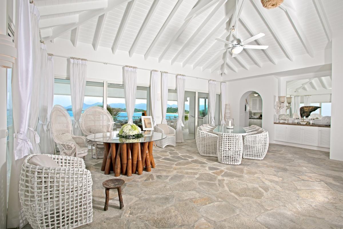L'Oasis has a large covered terrace which offers a further dining area for 12 and a beautiful ocean backdrop. Adjacent to both of the dining areas is a spacious gourmet kitchen. Large windows offer a beautiful view of the ocean.