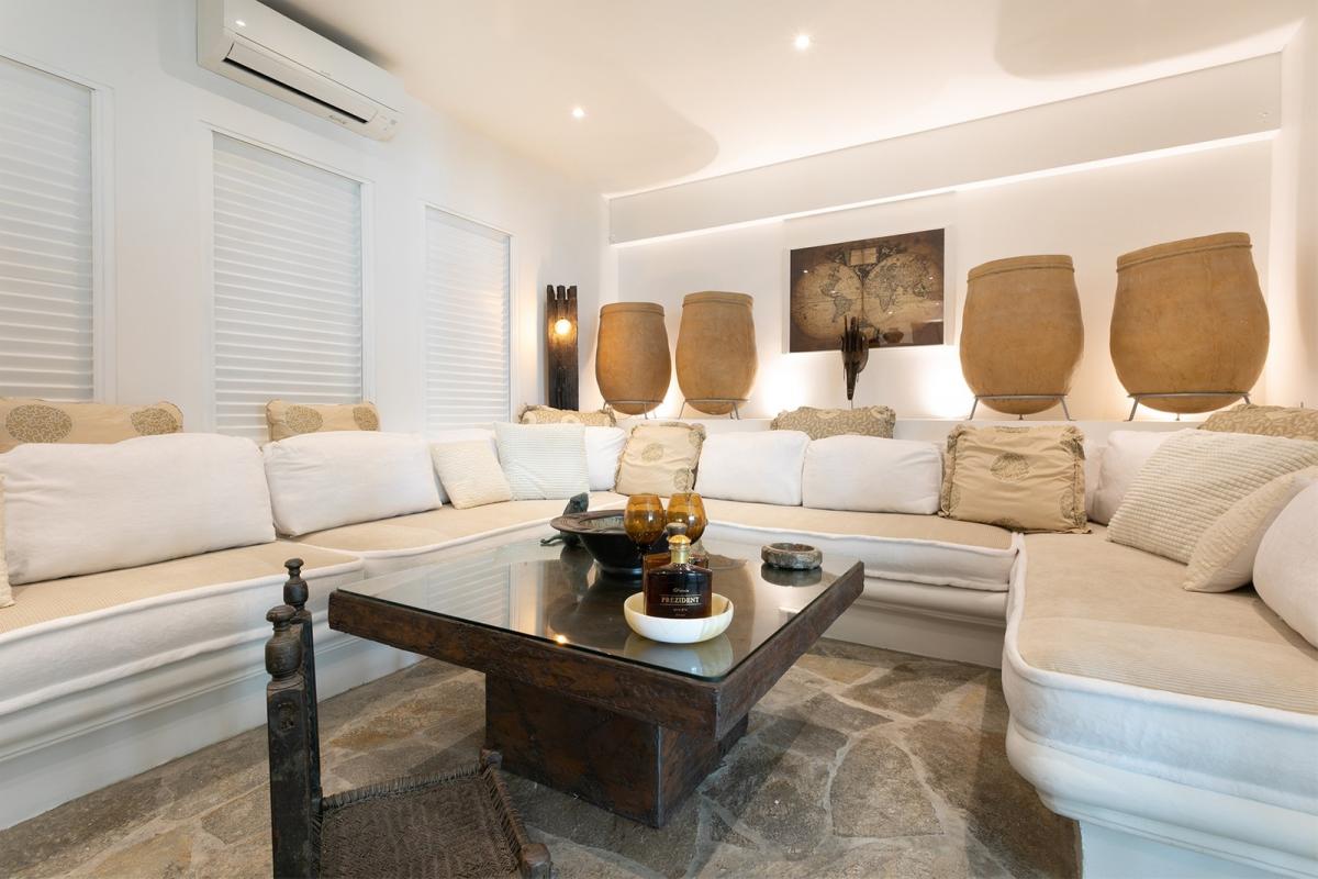 The main entrance invites guests into a domed reception area and large double doors lead to the grand living area. High ceilings and natural stone floors create a cool and refreshing contrast to the tropical climate outdoors. The living area makes the most of the cooling ocean breezes, the entire room also benefits from air-conditioning if desired. L'Oasis also offers comfortable lounge areas, a large indoor dining table with seating for 10, and an adjoining media room with a widescreen TV, surround sound, and more seating. There is wifi throughout the entire property.