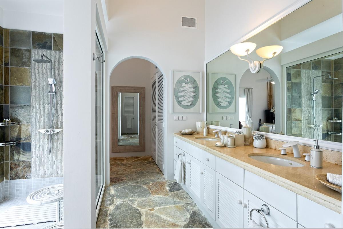 Main Pool by the House has a very large deck, many lounge chairs, stone table and chairs for pool side dining, umbrellas and full music system . The full SPA features a gym room equipped with Multi-Station Universal, a Tread-mill, an Elliptical, Free Weights, Plasma TV, Sound, an exterior Jacuzzi, a Massage room with two tables, a Manicure/Pedicure area, a Bathroom with Steam room, Shower and Toilet . To Marigot: 12 min. drive To Nearest Grocery Store: 5 min. drive To Beach: Out the door to Baie Rouge.