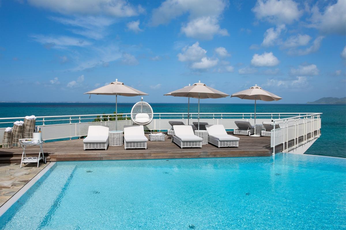 At the far end of Baie Rouge, one of St. Martin’s most sought after beaches, villa L'Oasis sits alongside the cliffs offering incredible sea views and luxurious surroundings. Built on three levels, following the incline of the cliff, this elegant and sophisticated beachfront home has six bedrooms, including 3 master suites and two beautiful pools, one at shore level and a second overflow pool on the main residential level.