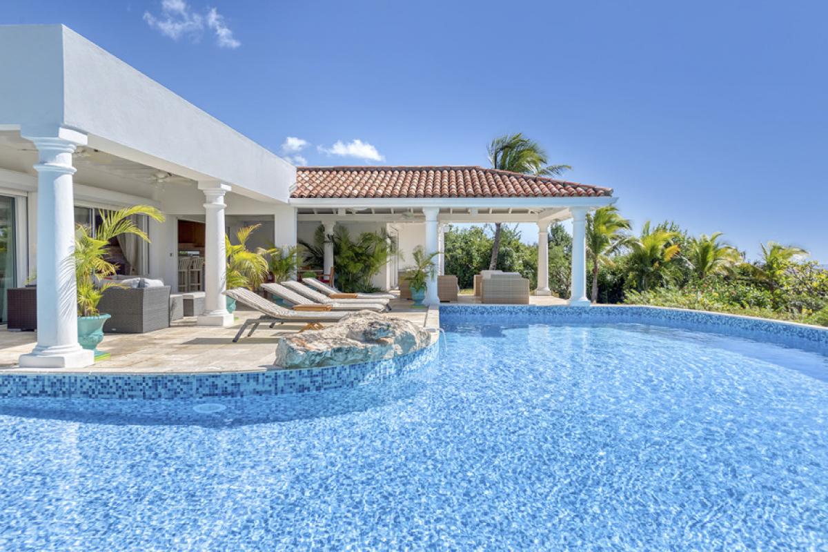 The charming well-equipped kitchen in soft stone tiles, painted teak and soft corals opens to the living space and the outdoors. Eat at the kitchen counter or on the outdoor covered loggia off the pool. Spacious outdoor terraces feature a lounging area with oversized weather resistant wicker sofas and comfortable al fresco dining areas. Contemporary chaises, surrounding the stunning tiled pool, face the sea and gardens.