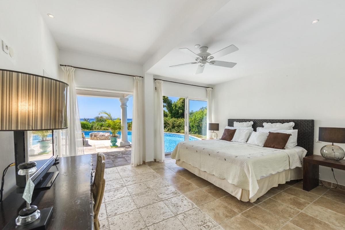 Two large bedrooms feel very private; one connected directly to the interior and one set off the terrace. Both have fabulous sea views and spa style travertine and teak bathrooms; one with private outdoor shower and one that opens to the sea view.