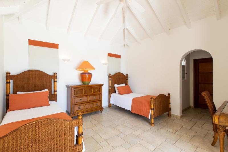 Bedroom 4: This room is equipped with twin-sized beds, an ocean view, a fan, air conditioning, and an ensuite bathroom.