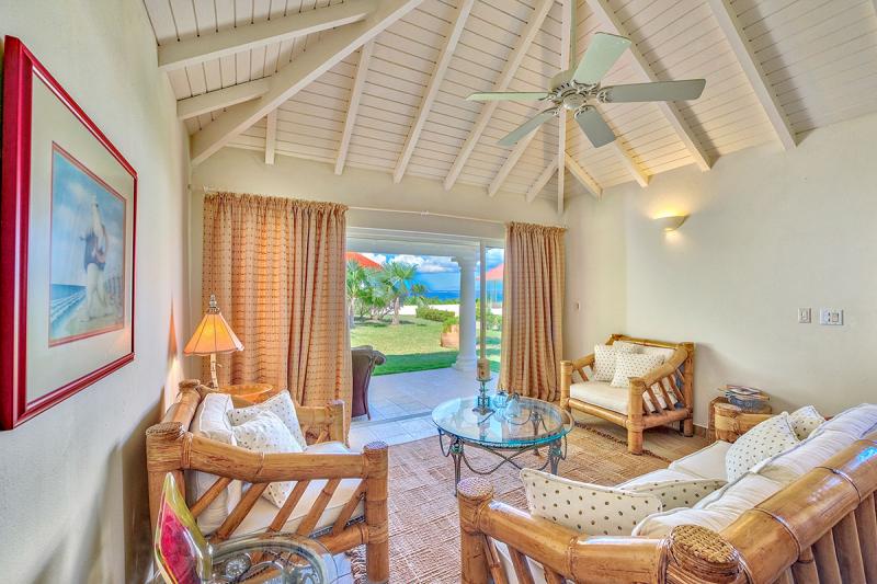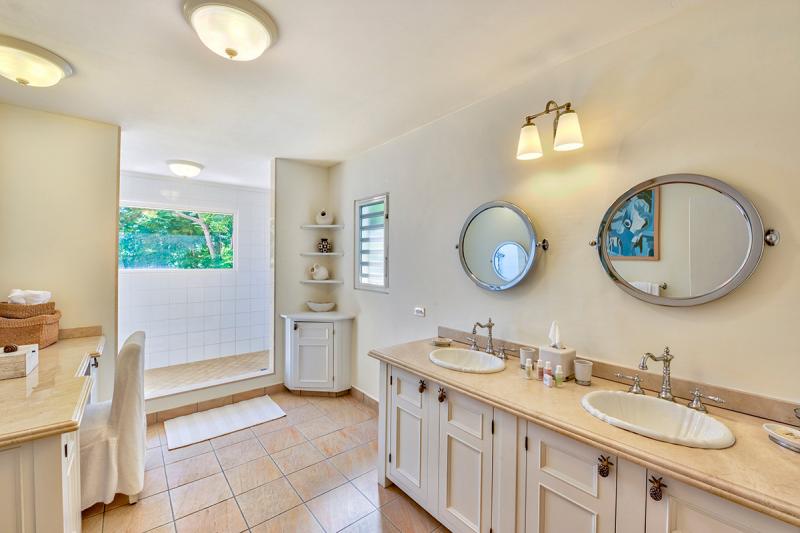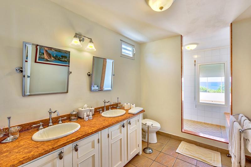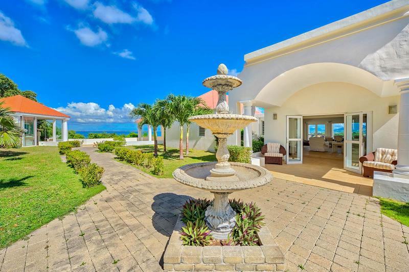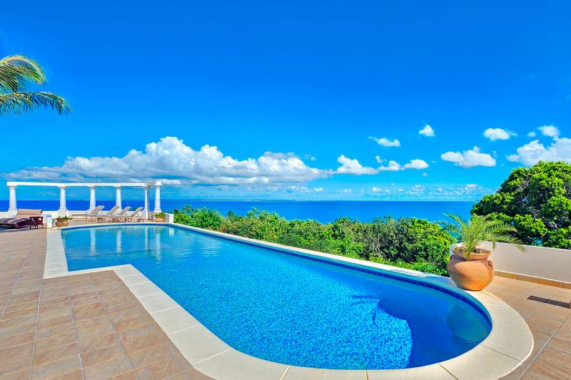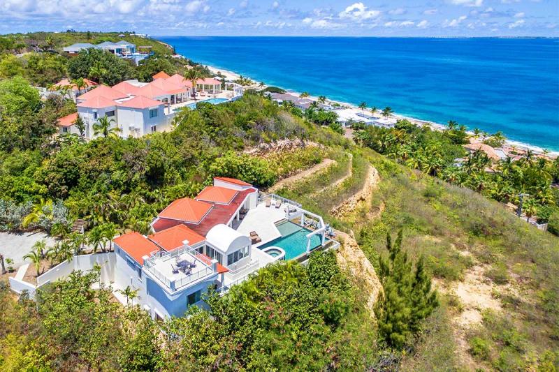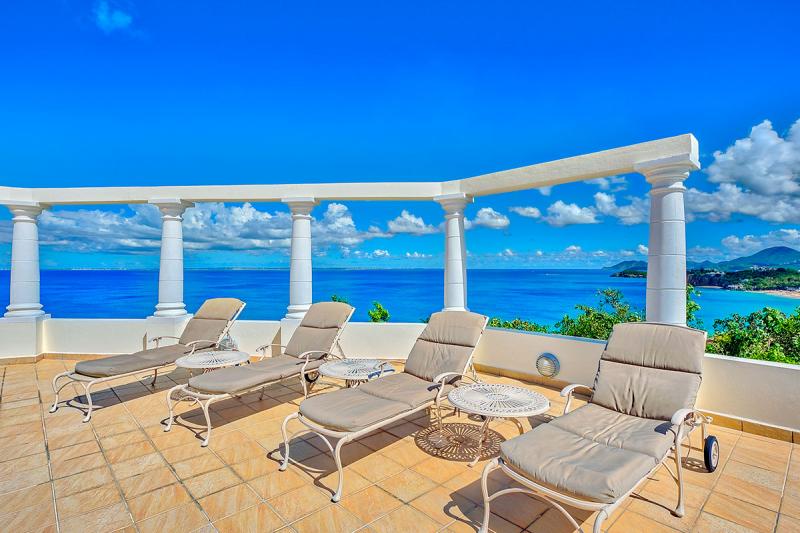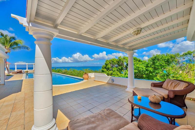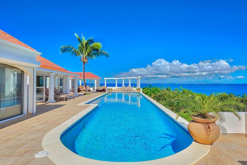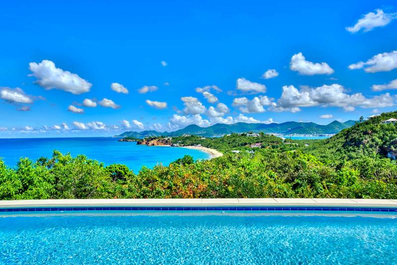 This brand new villa offers spectacular ocean view, a huge custom made kitchen with granite counter tops, a fantastic dining-living room with breathtaking views, a large plasma TV in sitting room with a collection of 200 DVDs and a charming gazebo with stunning views of Baie Rouge beach and Anguilla. This beautiful house turns to a super deluxe fully air conditioned four bedrooms hillside property. The heated pool has been enlarged twice its size, the patio area around the pool is very large and extends towards Bay Rouge. A large shade area has been built for this patio. The patio is extended to the pavilion. The fourth bedroom becomes a large bathroom and a new large bedroom has been added. New large furniture for the main living room and dining room. Plasma TV & DVD in each of the bedrooms. A large gym room has been added with complete equipment and a flat screen TV. A Jacuzzi has been installed in the patio. Free phone calls to USA & Canada (Vonage phone access) and Computer access with Internet high speed connection. Can be rented as a 2-3 & 4 bedroom villa!