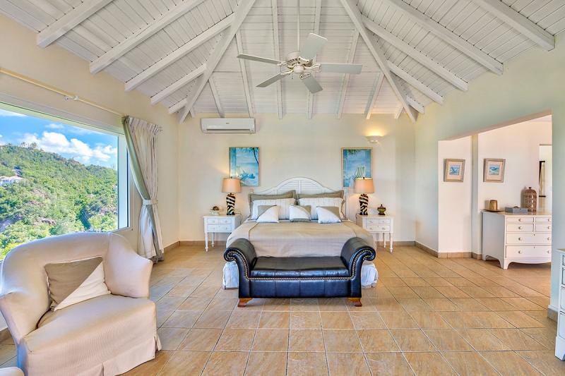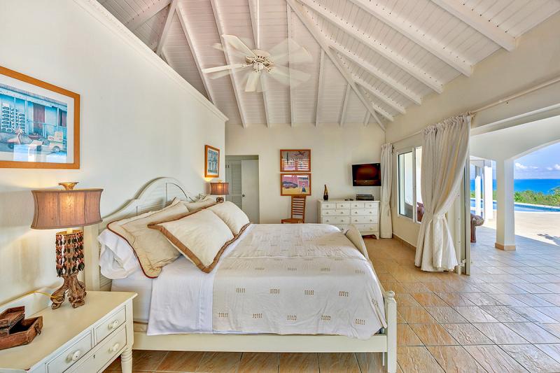 - Bedroom 1: King bed, private bathroom with shower, AC, ceiling fan, TV