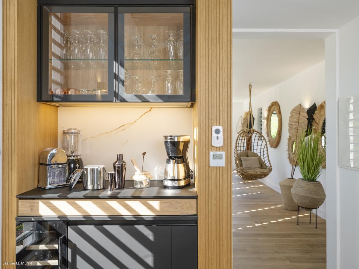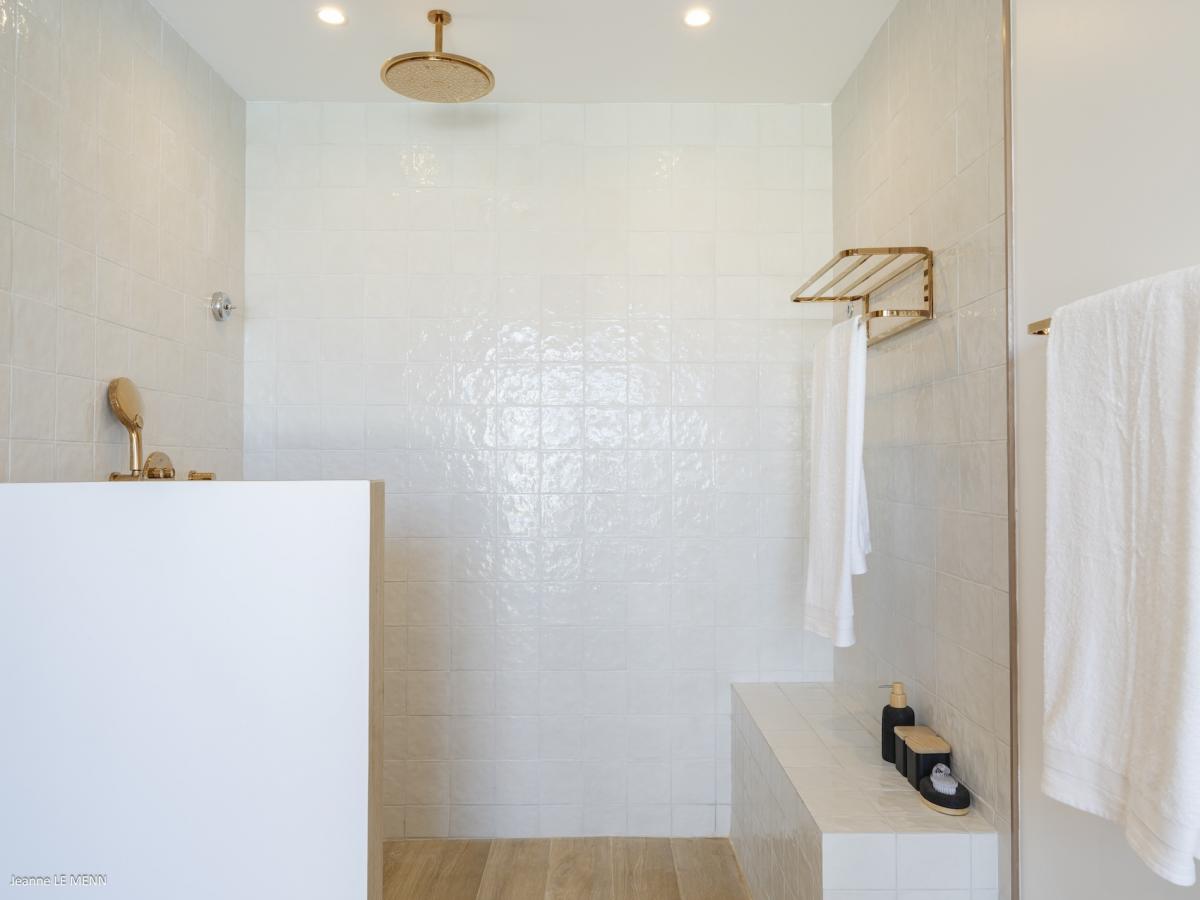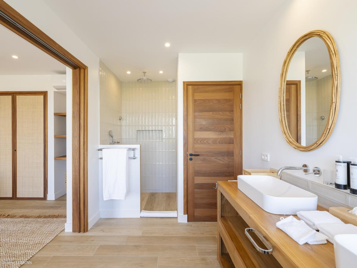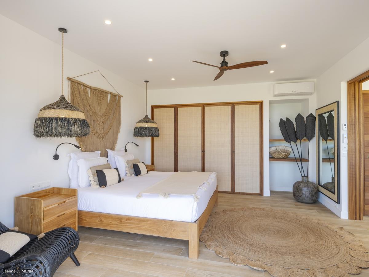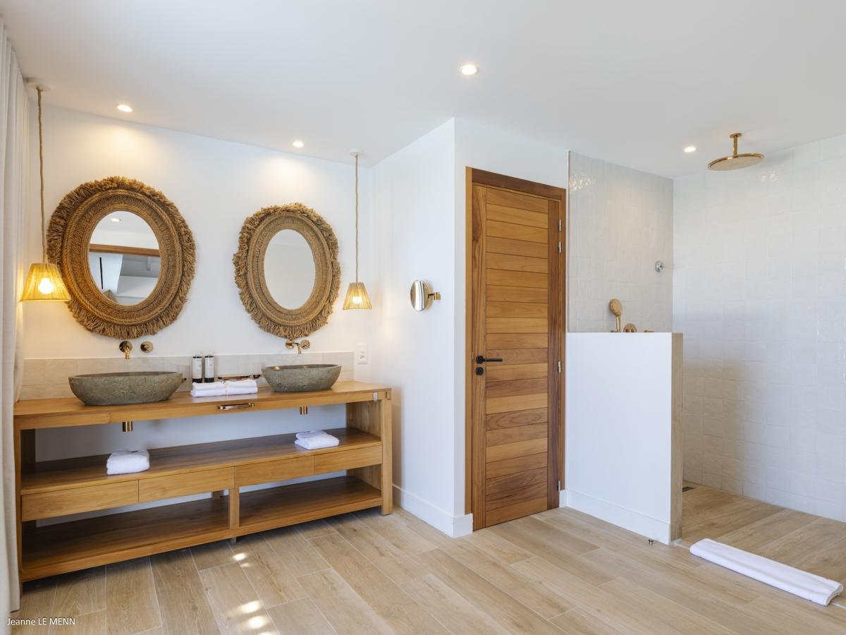 Each of the five bedrooms provides unobstructed views of the horizon and complete privacy. Three of the bedrooms are on the same level as the main living and the remaining two are accessible via a small staircase beside the pool, open onto private terraces. All bedrooms have bright ensuite bathrooms featuring a walk-in closet.