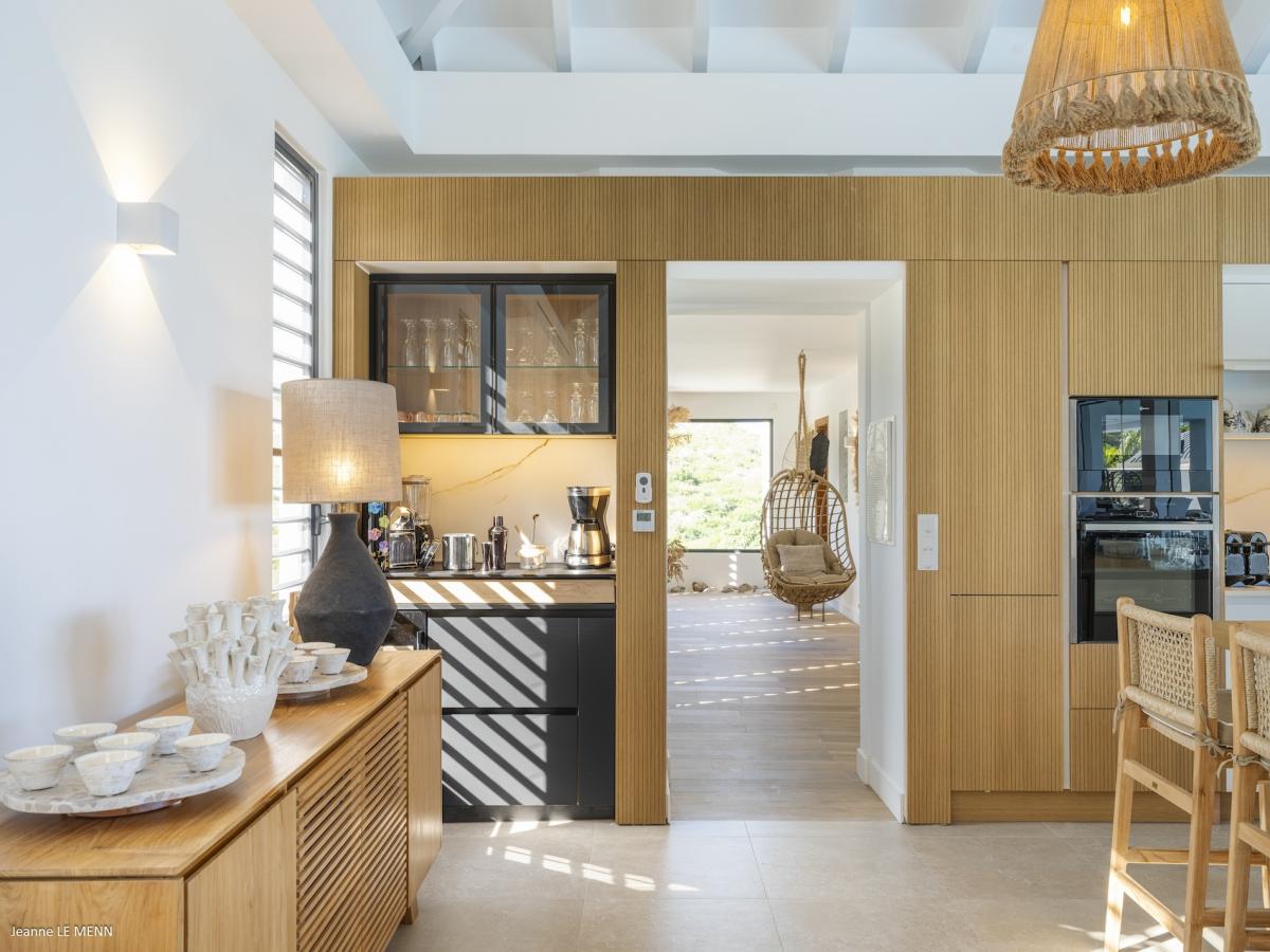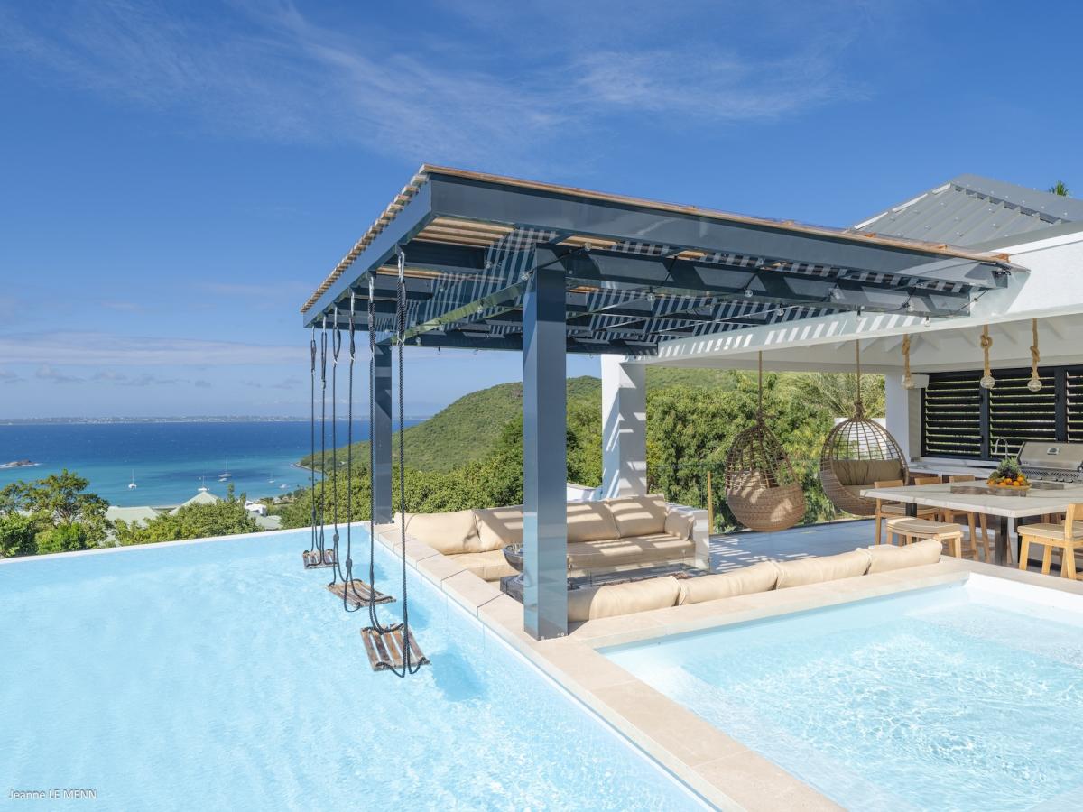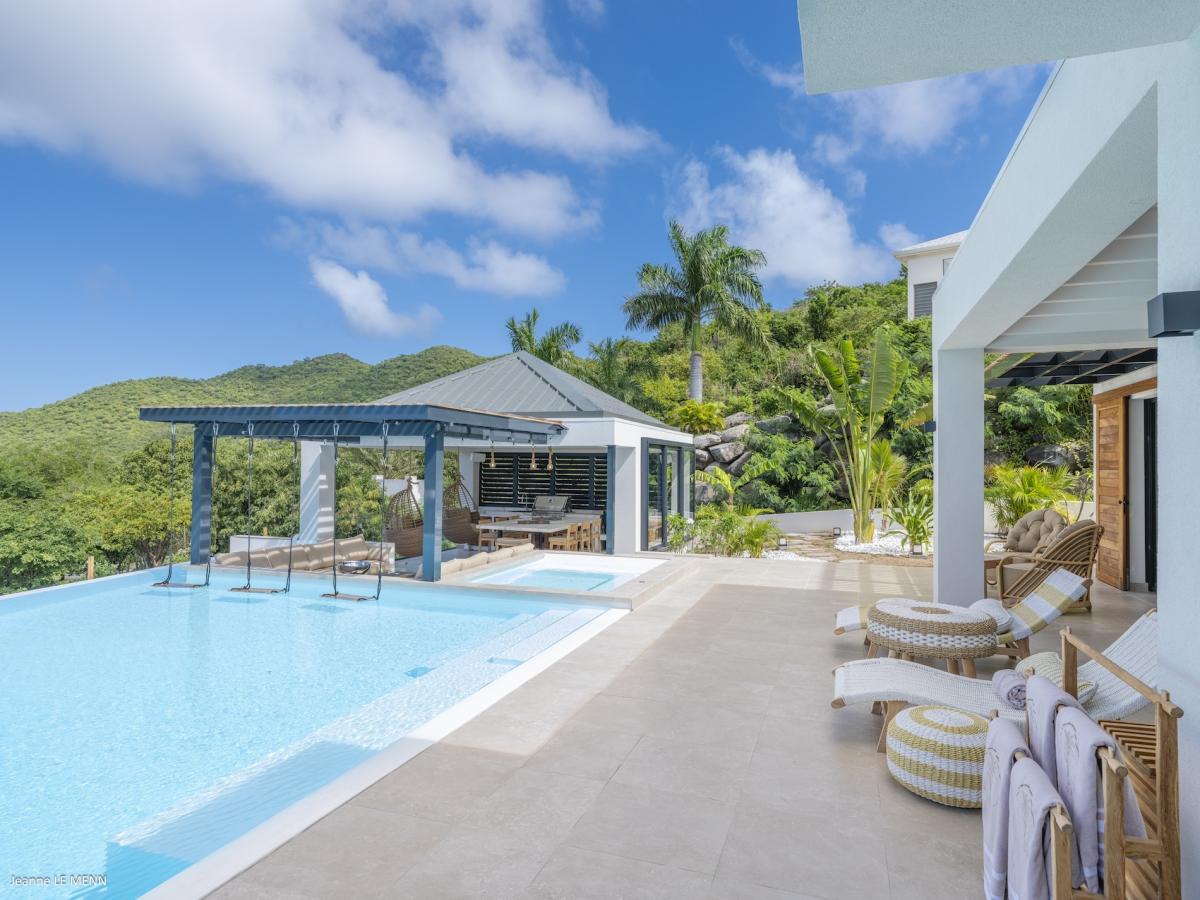 Villa Abaca is an exceptional St Martin villa rental nestled in the heights of Anse Marcel. It is a stunning five-bedroom residence offering breathtaking ocean views and seamless indoor-outdoor living. This luxurious St Martin villa features an expansive living room that connects to an infinity pool, creating a harmonious space filled with natural light.