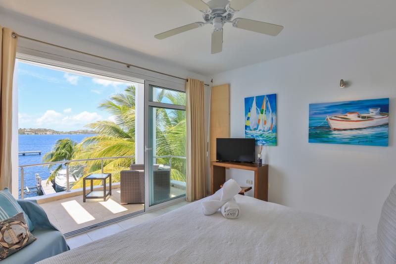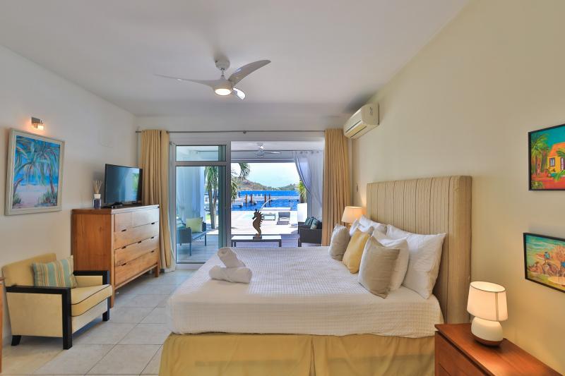 Bedroom 4: This room is equipped with a queen-sized bed, a lagoon view, a fan, air conditioning, a TV, and an ensuite bathroom.