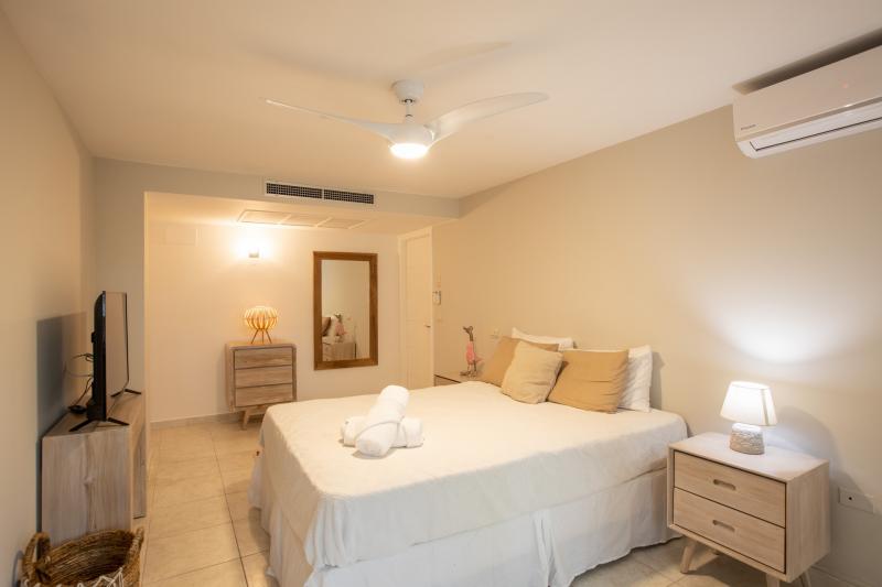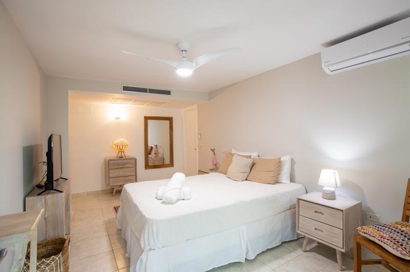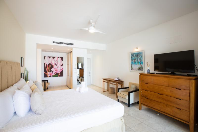 Bedroom 1: This room is equipped with a queen-sized bed, a lagoon view, a fan, air conditioning, a TV, and an ensuite bathroom.
