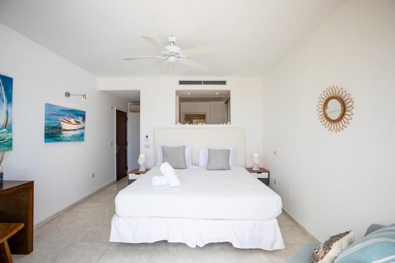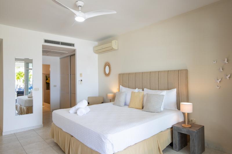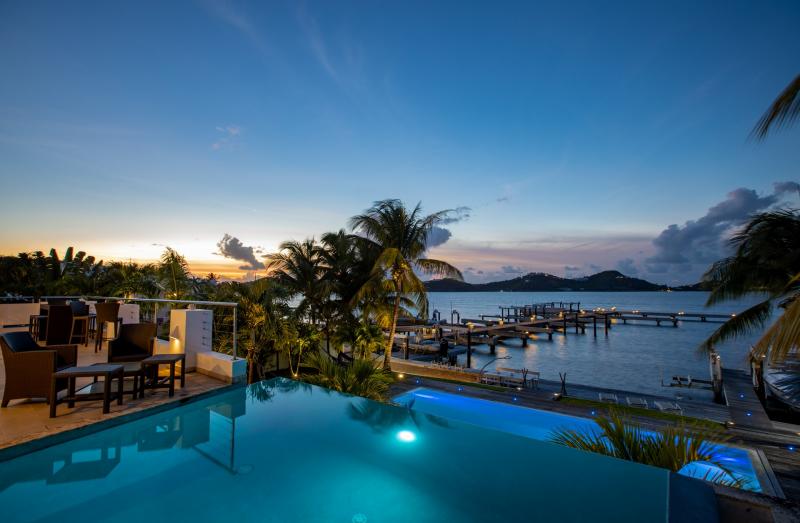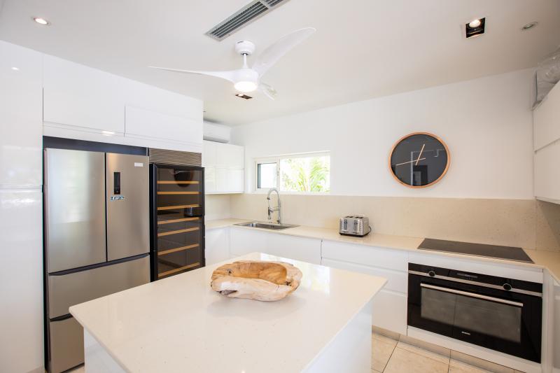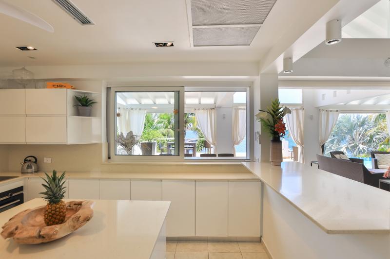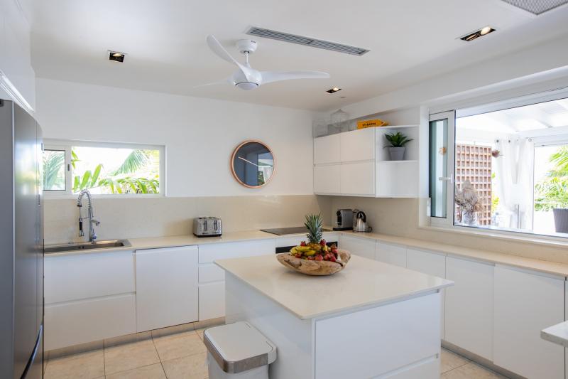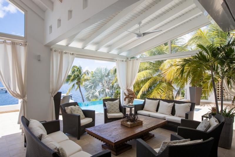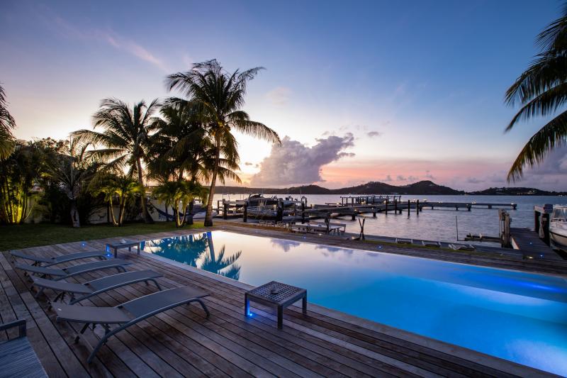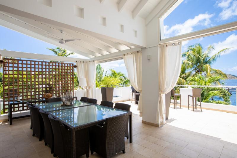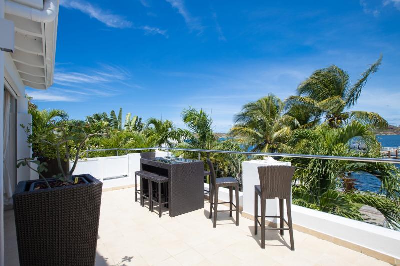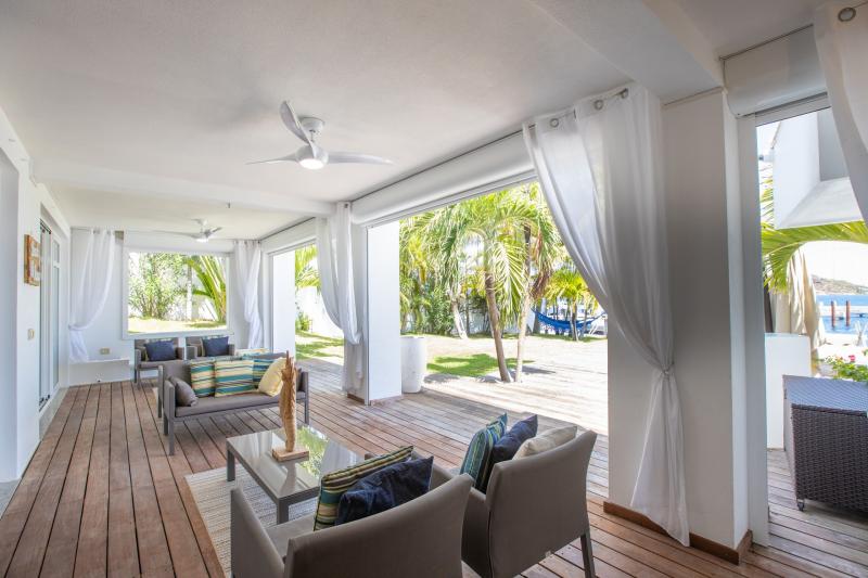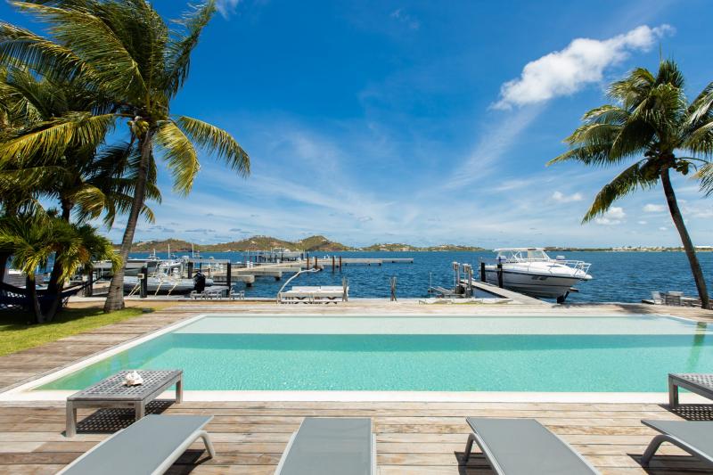 Villa Abracadabra is a luxurious property located in the exclusive Aquamarina area of Saint Martin, offering breathtaking views of the lagoon from its private dock. This St. Martin villa features five spacious bedrooms, four of which have lagoon views, dressing rooms, and ensuite bathrooms, while the fifth also offers an ensuite bathroom. Each bedroom is equipped with a Smart TV, ensuring comfort and entertainment for all guests. The living room opens to a covered terrace overlooking the lagoon and is equipped with fans, providing a cool and relaxing atmosphere. The large, fully fitted kitchen also offers stunning views, making it a perfect spot for cooking and socializing.