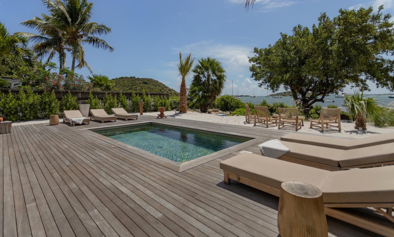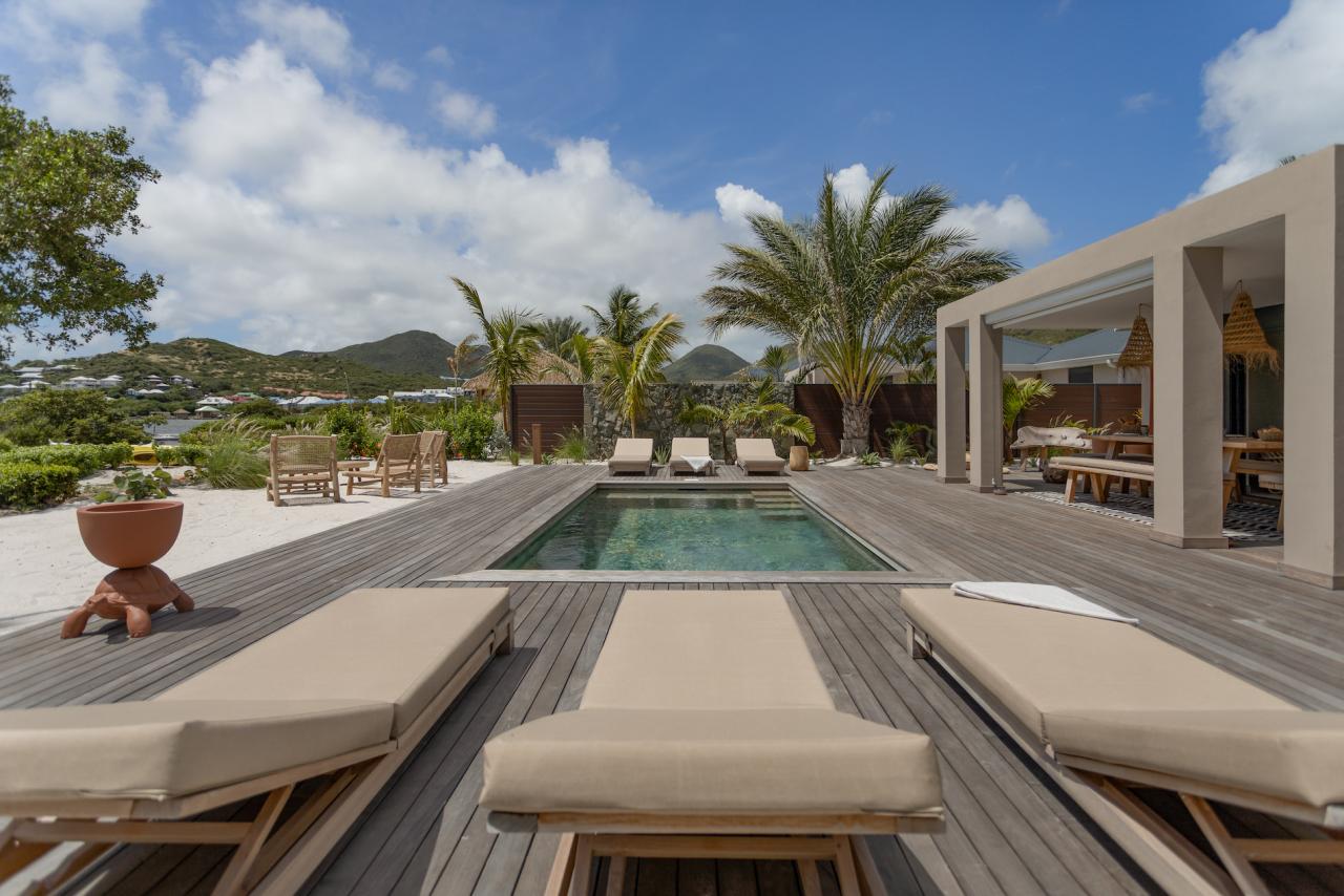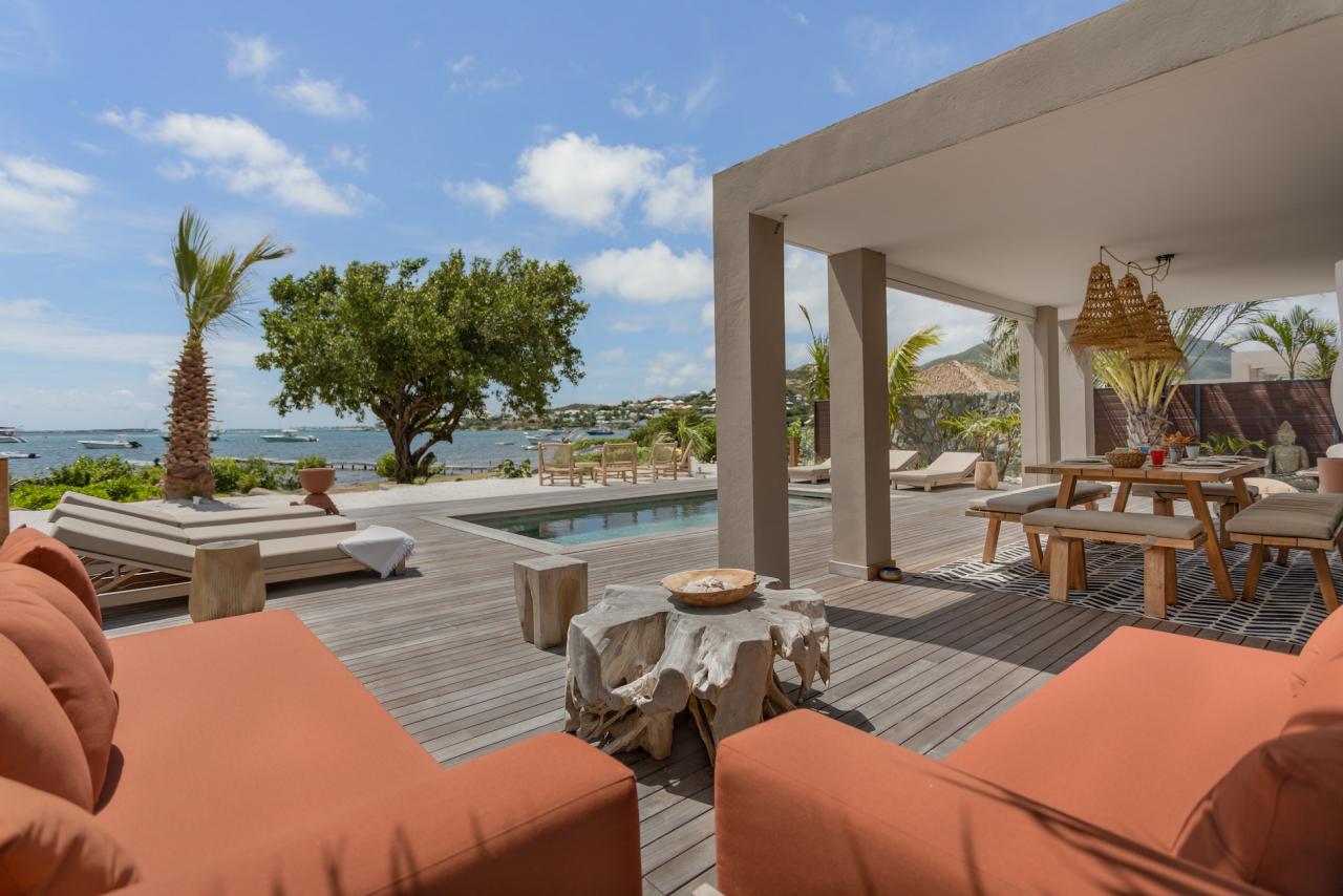 Villa The Beach House, set along the tranquil waters of Cul de Sac Bay in Saint Martin, offers an exquisite balance of modern elegance and Caribbean serenity. This stunning St Martin villa immerses you in a world where natural light, ocean breezes, and sweeping sea views define every moment. Expansive sliding glass doors open the interior to the outdoors, creating a seamless flow between the airy living spaces and the sun-drenched terrace. Guests can enjoy shaded seaside lunches, relax in the outdoor lounges, or savor sunset cocktails beneath the gazebo while gazing toward Pinel and St. Barts—perfect for an unforgettable St Martin vacation.