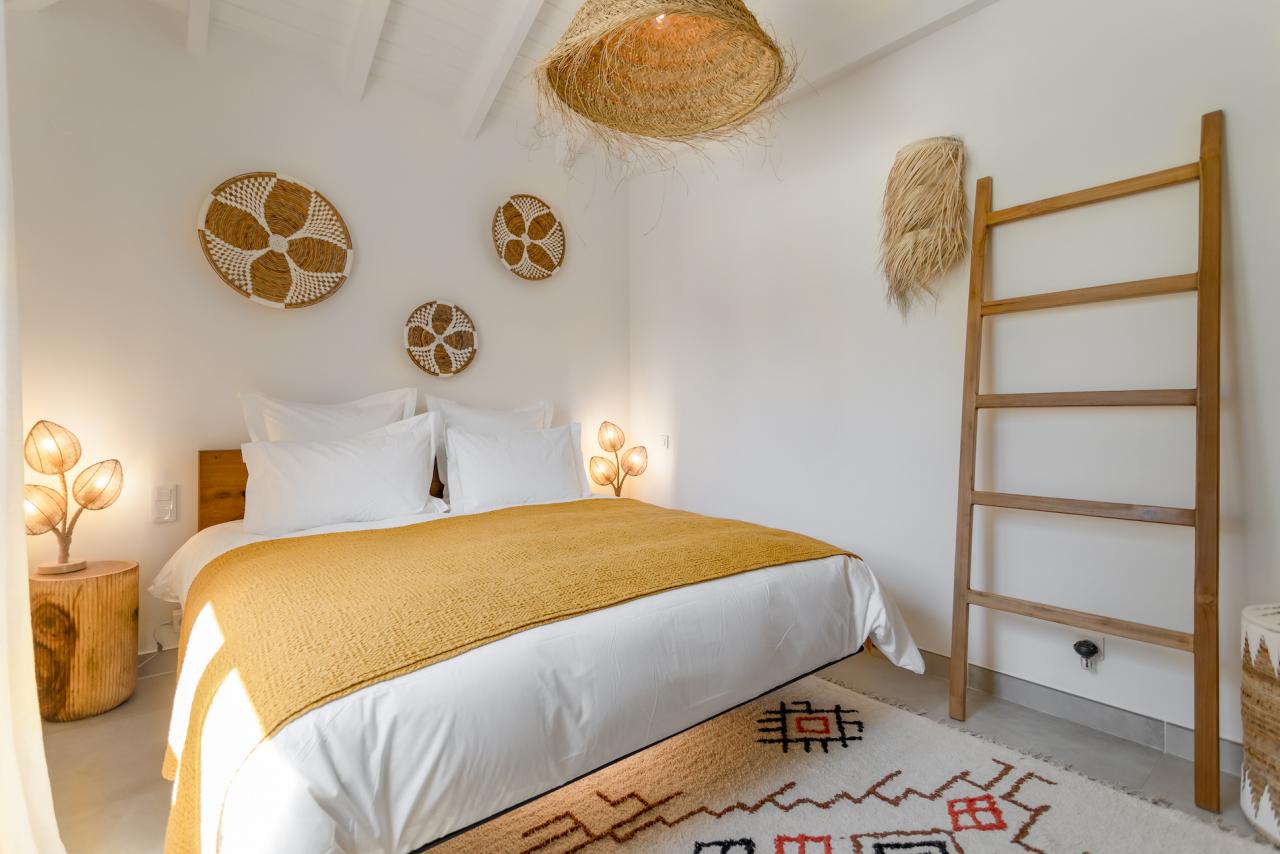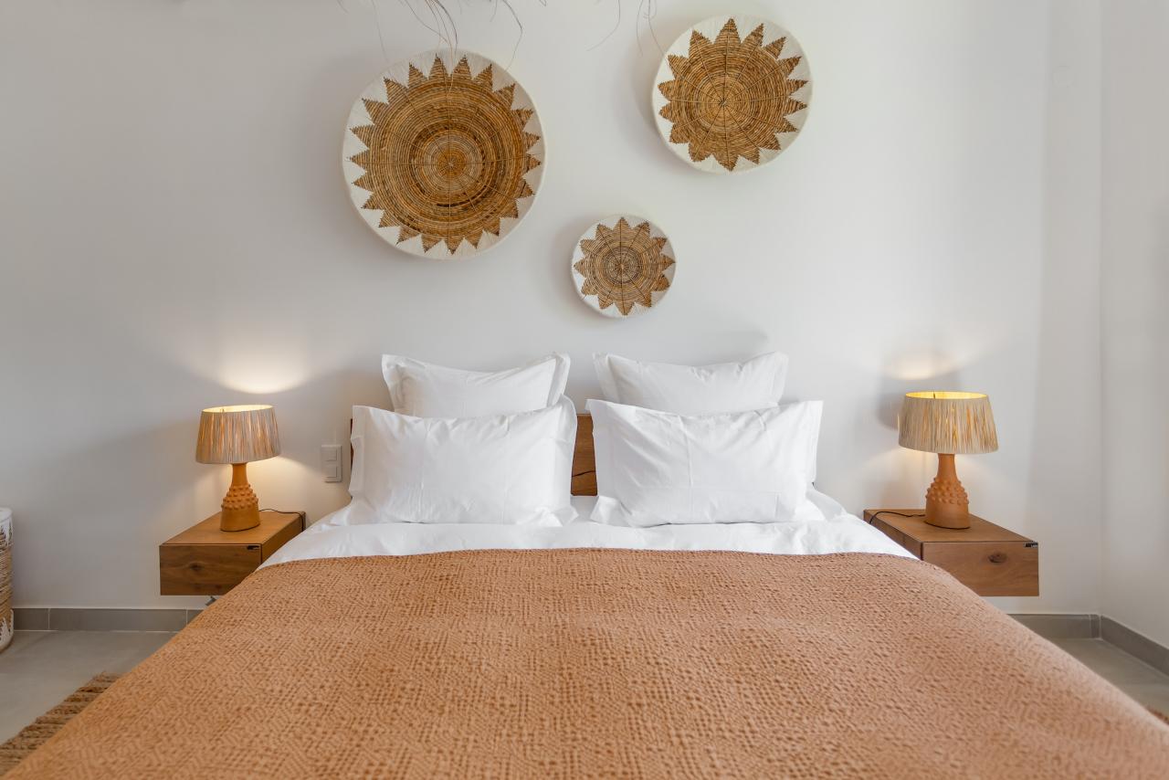 At the heart of the villa lies a heated pool overlooking the turquoise bay, inviting swims at any hour surrounded by endless ocean hues. The three king-bedded bedrooms are thoughtfully designed for both comfort and tranquility. The primary suite offers breathtaking sea views and a private en-suite, while the other two share a sleek, modern bathroom—one with direct access to the terrace for sunrise views. The kitchen, fully equipped and elegantly open, serves as the social hub of the home, where a central island and panoramic windows make even casual meals feel luxurious.
