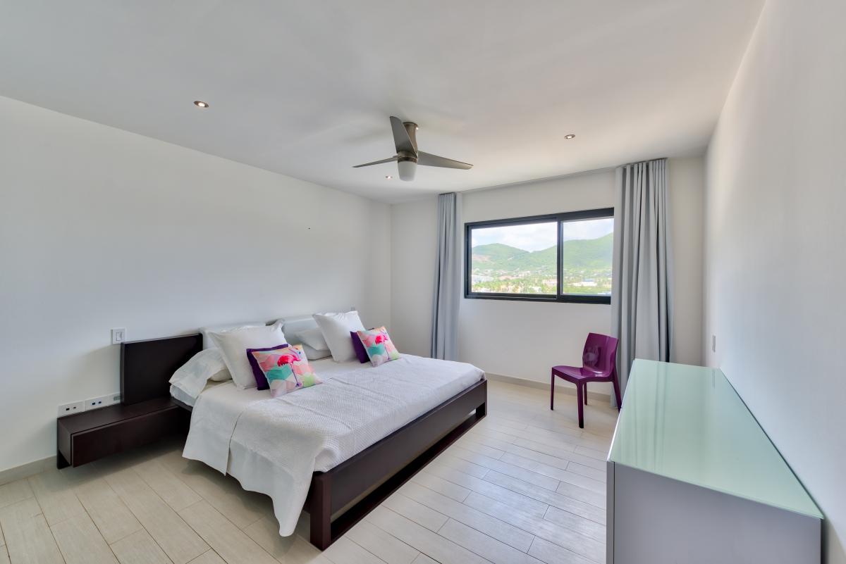Bedroom 3: King bed, lagoon and yacht view, ceiling fan, 110V, ensuite bathroom with shower and hair dryer, safe