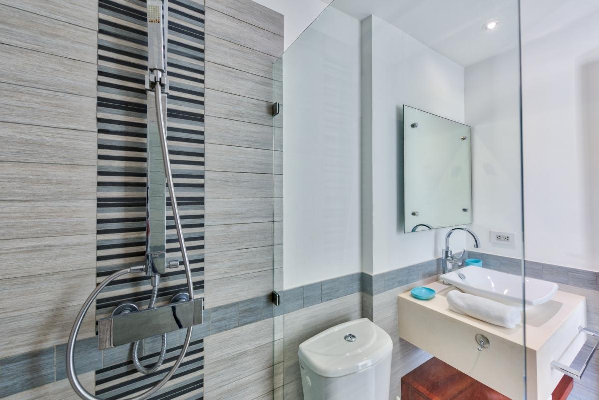 Bedroom 1: King bed, terrace and pool view, ceiling fans, 110V, ensuite bathroom with shower and hair dryer.