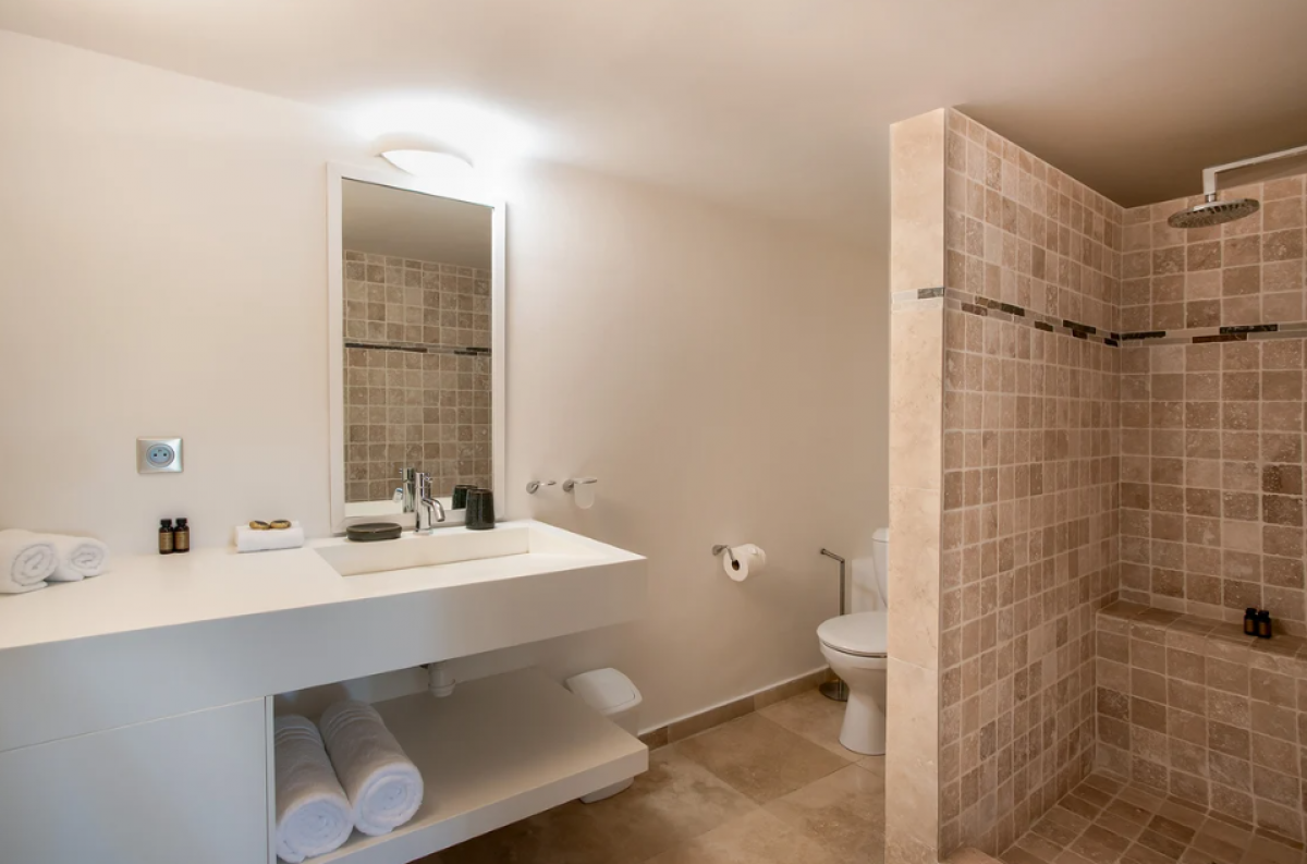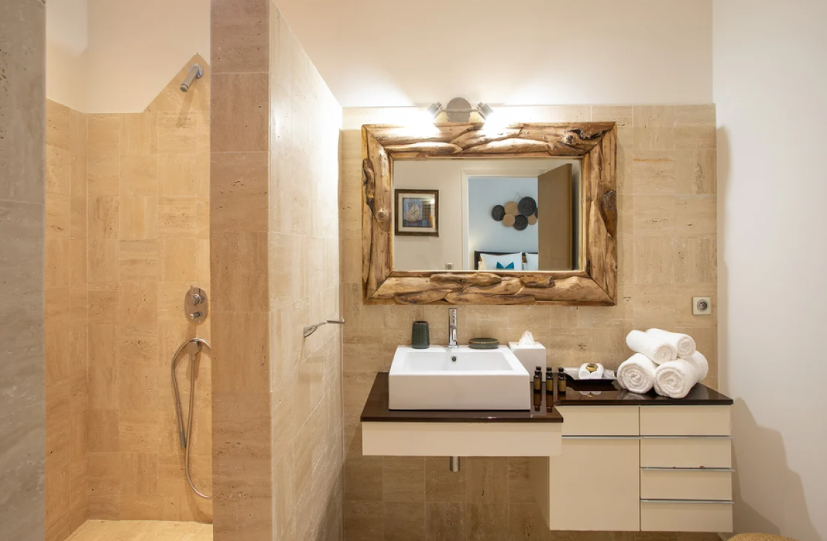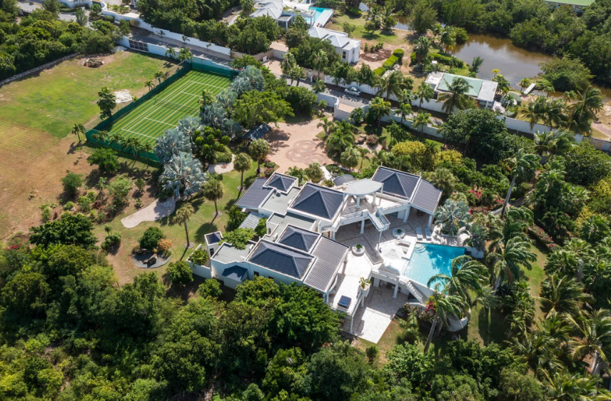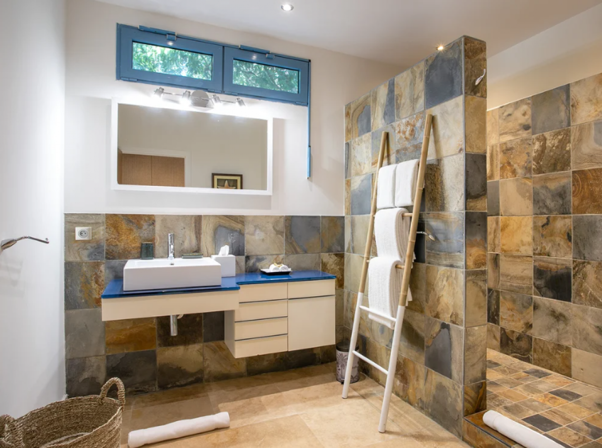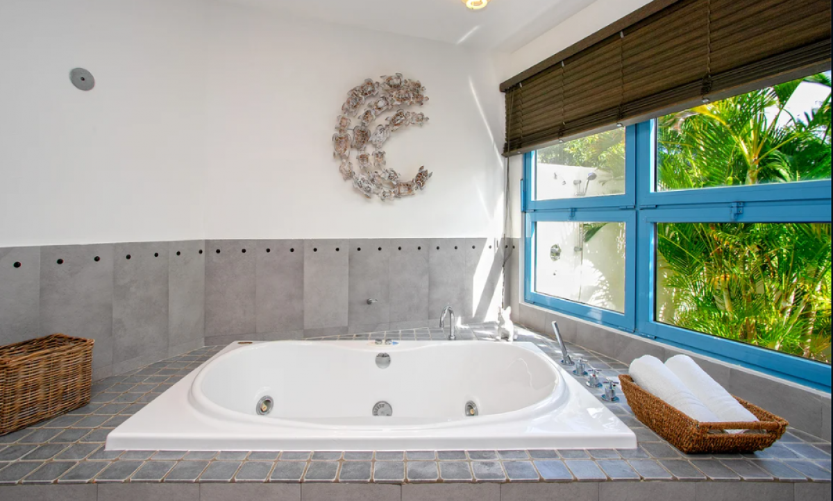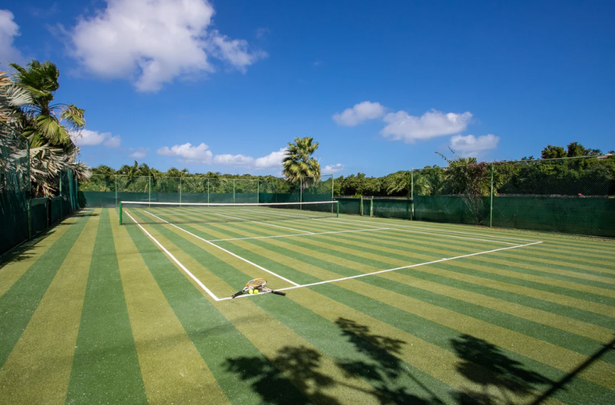 Villa Les Palmiers Bleus is located in the heart of the private and gated enclave of the Terres Basses, St Martin. Located within a couple of steps from the beautiful beach of Plum Bay, Villa Les Palmiers Bleus is a haven of luxury. Fully air-conditioned, this villa has 4 spacious bedrooms, each with their own en-suite bathrooms and a studio as a 5th bedroom with a bathroom. The 3rd and 4th bedrooms open to the exterior and have a view of the garden. Villa Les Palmiers Bleus has a private tennis court. The heated pool is surrounded by tall coconut trees and palm trees.