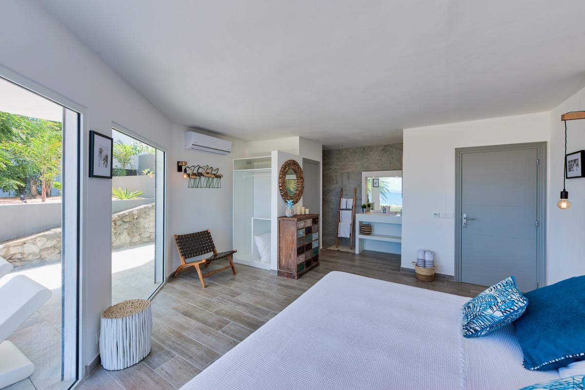 Bedroom 1: This room is equipped with a king-sized bed, an ocean view, a fan, air conditioning, a safe, and an ensuite bathroom.