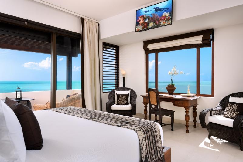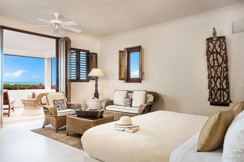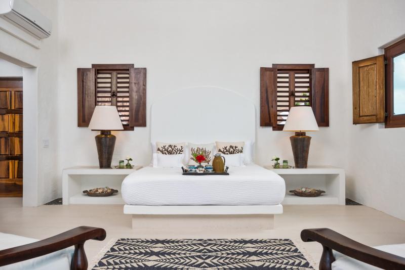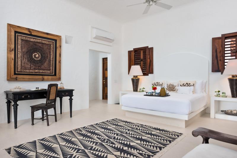 Bedroom 5: King bed, en suite bathroom with shower and tub, hairdryer, AC, ceiling fan, flat screen TV, safe, telephone, window screens, private terrace, walk-in closet