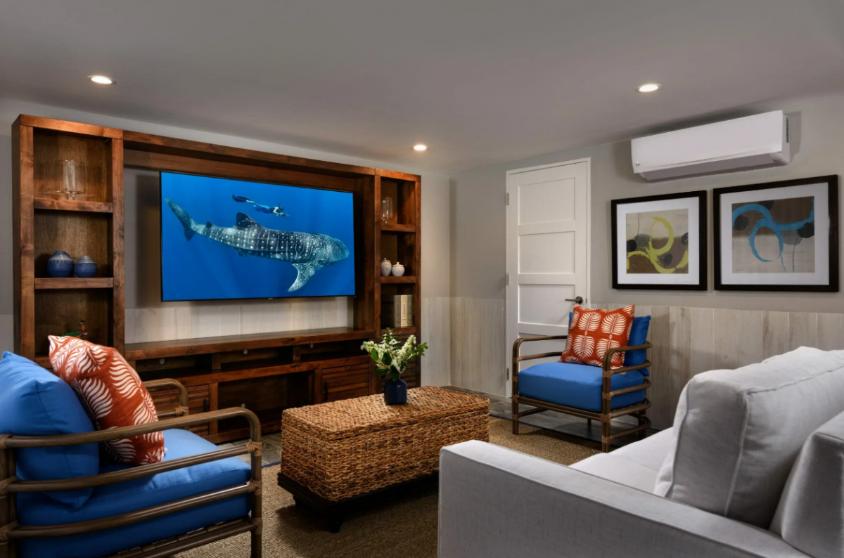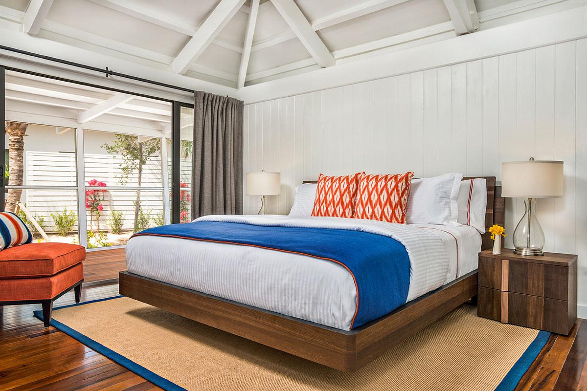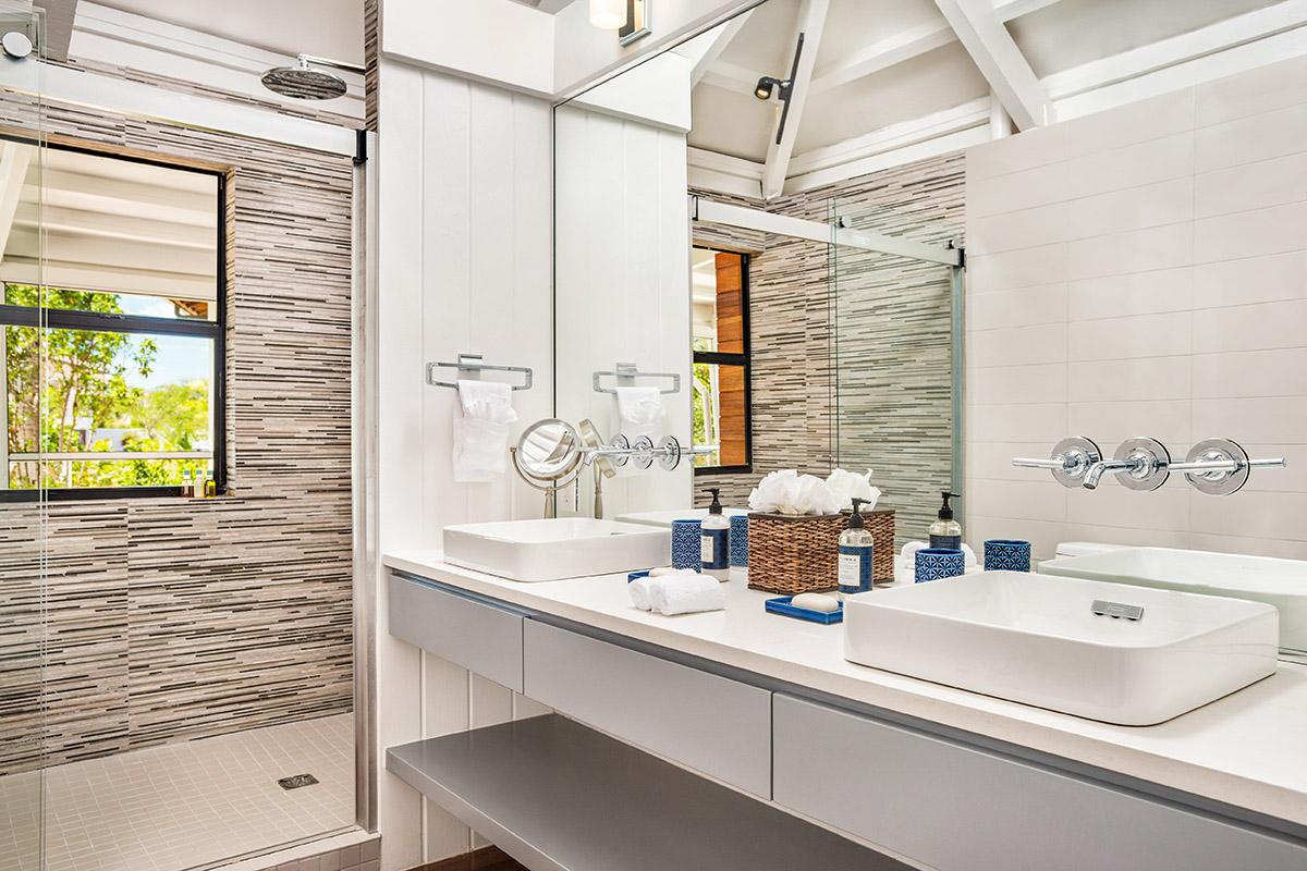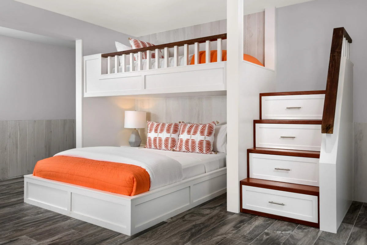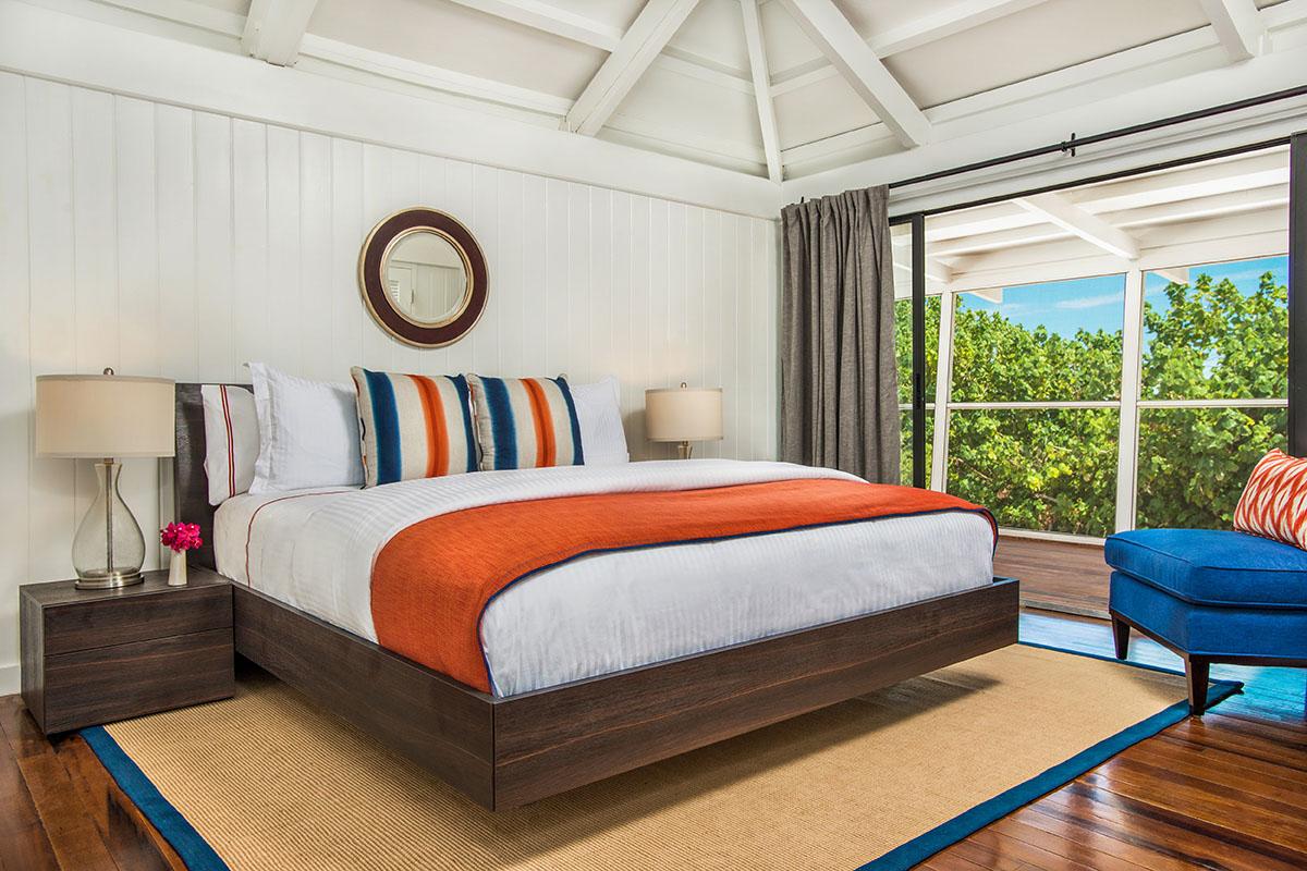 King-size suites flank the great room, each boasting pitched roofs, contemporary bathrooms, and sliding glass doors that open onto the veranda. On the lower ground floor, a third bedroom—featuring a twin bunk above a queen-size bed and a cozy seating area—offers an ideal retreat for a family with a young child or a couple desiring additional privacy.