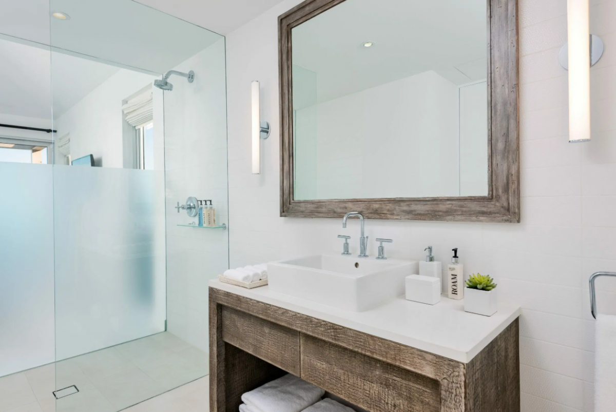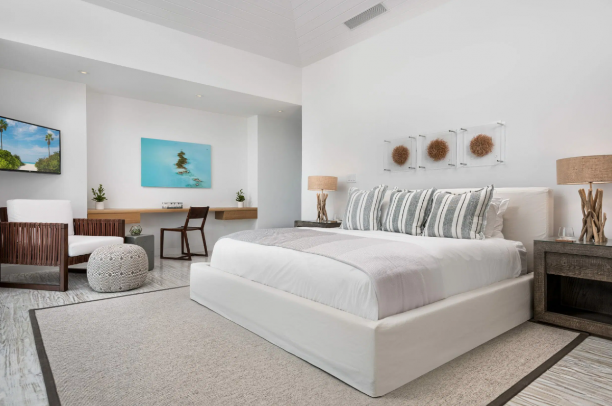 Bristol Bliss is a stunning 3,200 square foot beachfront home offering guests four frontal ocean view suites with large ensuite bathrooms all centered around the home’s open concept ‘Great Room’. The Great Room has a large, well equipped, contemporary kitchen, complete with a full chef’s selection of appliances and cooking utensils. Guests will also find a large interior dining room that accommodates eight comfortably as well as a spacious living room with a large 65″ flat screen television located in the Great Room. The interior/exterior zoned surround sound system is powered by Sonos and can wirelessly be controlled by phone or tablet by simply downloading an app. The interior space can be opened up to the exterior pool deck via the villa’s large sliding doors. The pool deck offers guests lots of exterior seating in the form of plush sofas and lounge chairs. There is a large eight seater exterior dining table that is covered under the villa’s roof and positioned conveniently beside the outdoor propane barbeque. The shallow but large salt water pool is ideal for families with young children, seniors or guests that are less comfortable in a deeper pool.