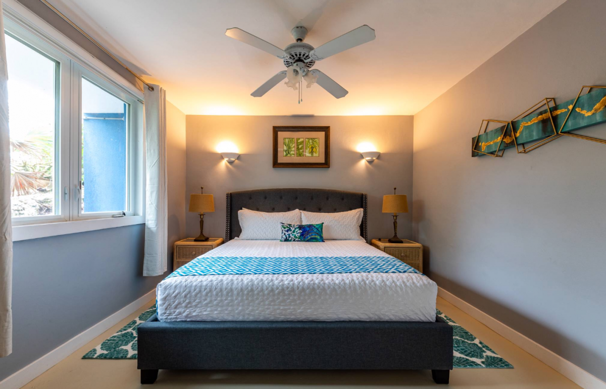 - Bedroom 2: King bed, en suite bathroom, ceiling fan, AC