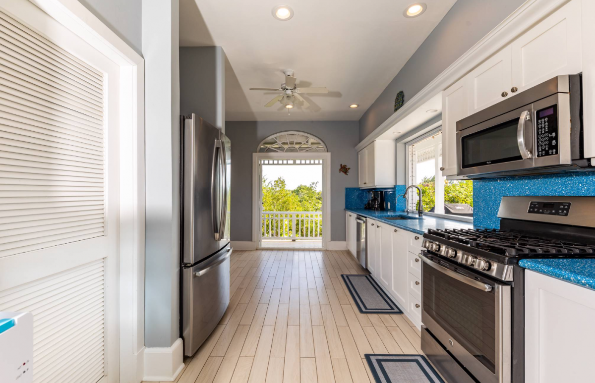 This vacation villa is three floors: The ground floor is a self-contained apartment with its own exterior entrance (as well as an interior staircase to the upper level), living room, bedroom and full bath.