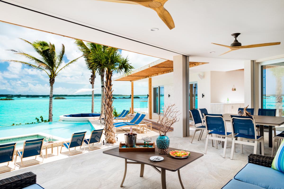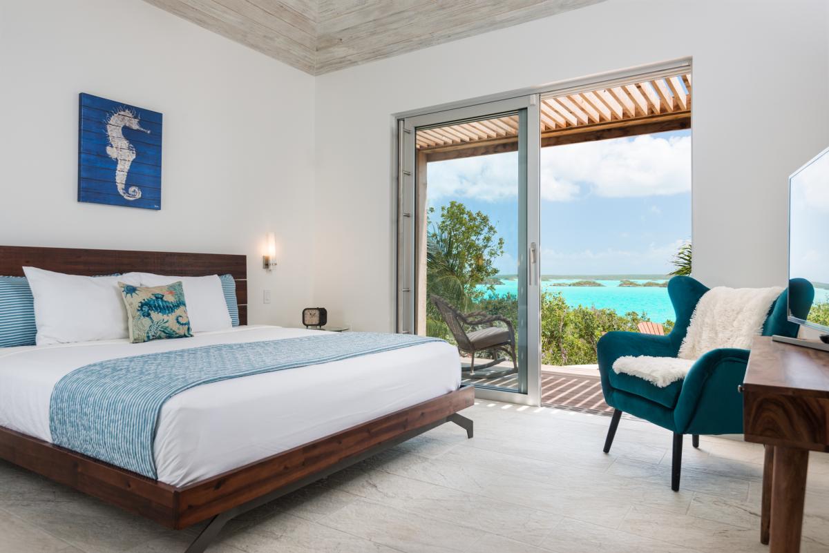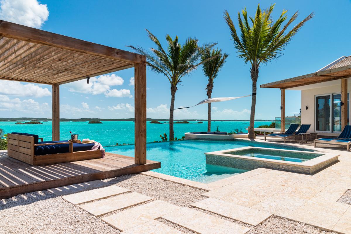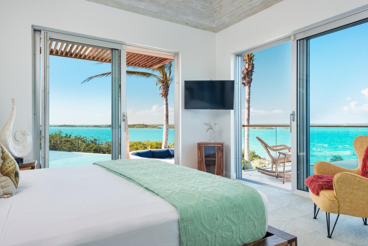 Villa Alinna provides guests with a fabulous Turks and Caicos vacation. There are five bedrooms in this luxury villa. Four of these bedrooms are master bedrooms and are appointed around the villa's large swimming pool and jacuzzi which allows guests to enjoy frontal views of Chalk Sound. The fifth bedroom is set up as a bedroom for kids. The room has two bunk-style beds with an ensuite bathroom. The inside living area is set up in an open concept style. The kitchen has top-of-the-line appliances that include an electric cooktop, an oven, a microwave, and a small ice machine. In the living room, there is a sectional sofa that is large and can comfortably seat guests, and there is a large flat screen monitor with standard cable television. There is also a sound system in the interior and exterior that is operated through an application that is able to be downloaded for free on a smartphone.