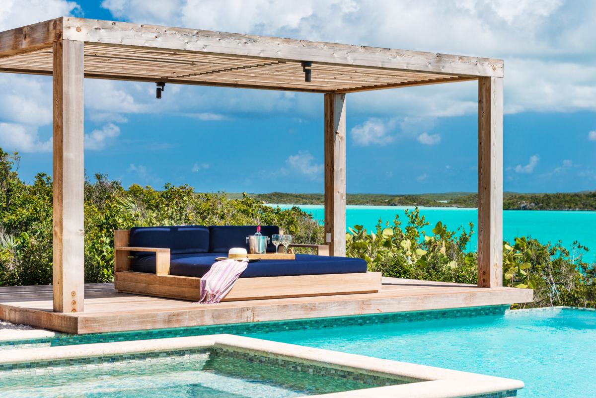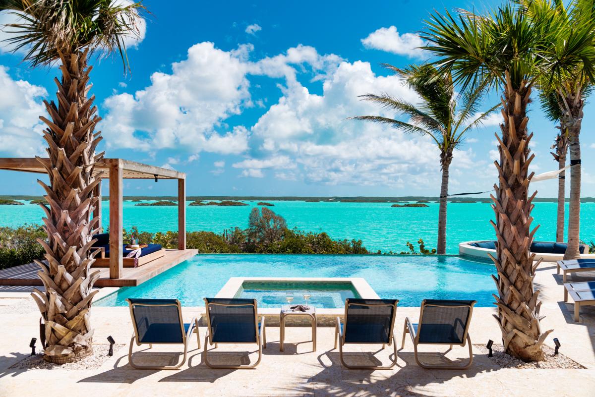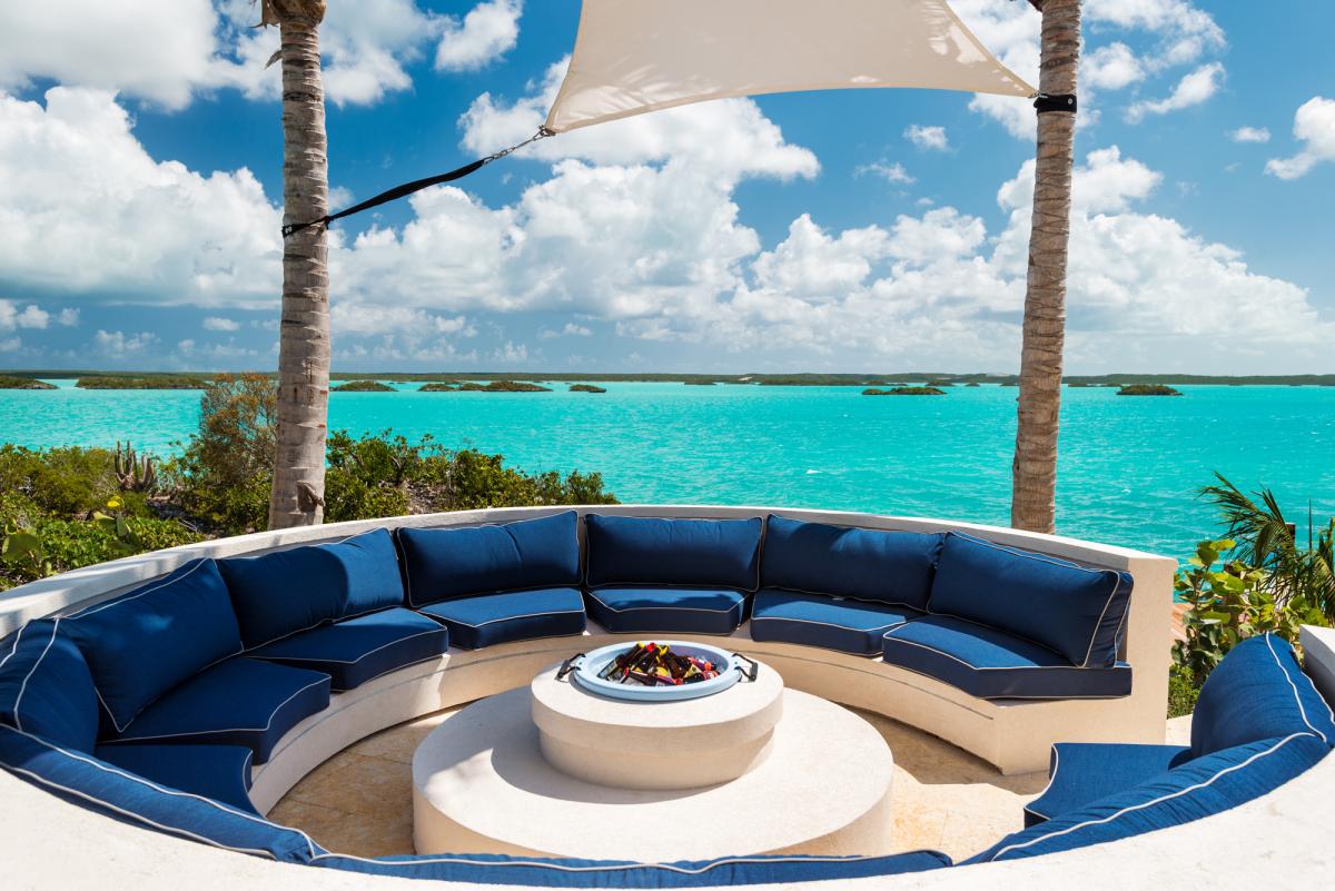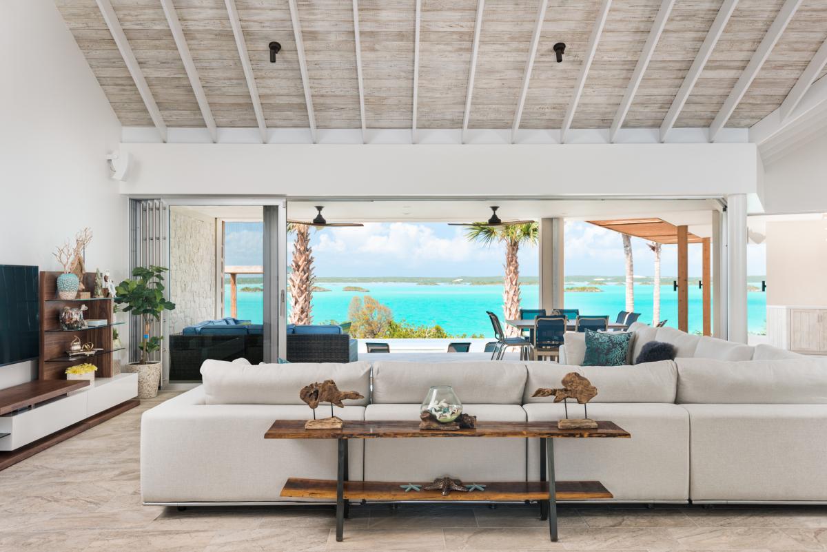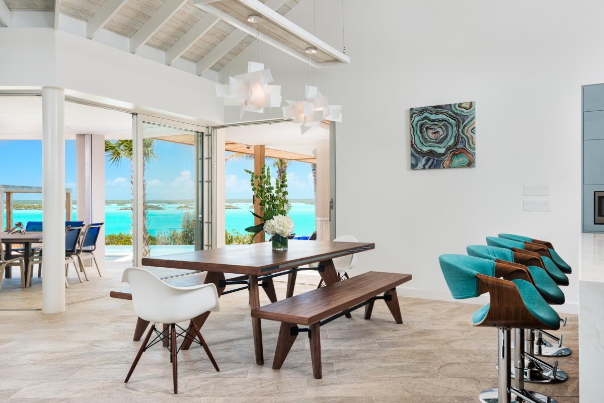 Villa Alinna provides guests with a fabulous Turks and Caicos vacation. There are five bedrooms in this luxury villa. Four of these bedrooms are master bedrooms and are appointed around the villa's large swimming pool and jacuzzi which allows guests to enjoy frontal views of Chalk Sound. The fifth bedroom is set up as a bedroom for kids. The room has two bunk-style beds with an ensuite bathroom. The inside living area is set up in an open concept style. The kitchen has top-of-the-line appliances that include an electric cooktop, an oven, a microwave, and a small ice machine. In the living room, there is a sectional sofa that is large and can comfortably seat guests, and there is a large flat screen monitor with standard cable television. There is also a sound system in the interior and exterior that is operated through an application that is able to be downloaded for free on a smartphone.