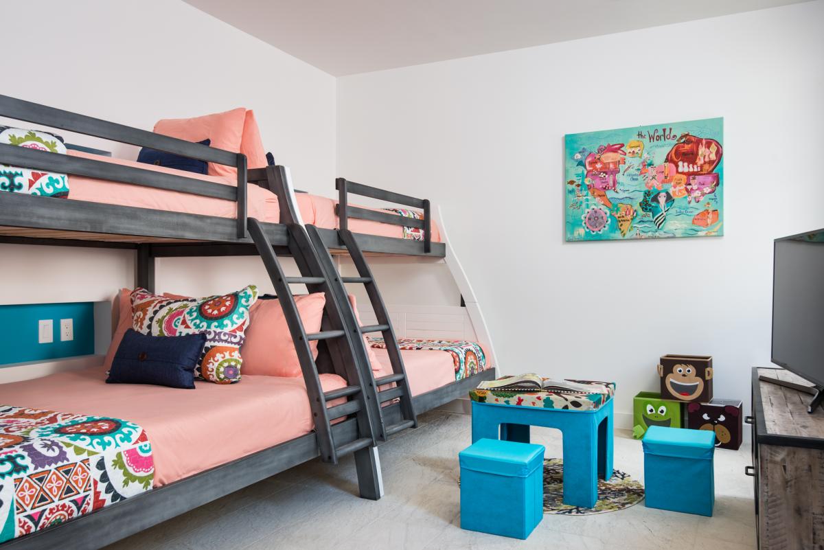 Bedroom 5: The room has two queen-sized beds, two twin-sized beds, a TV, and air conditioning. The room has an ensuite bathroom equipped with a bathtub and double sinks.