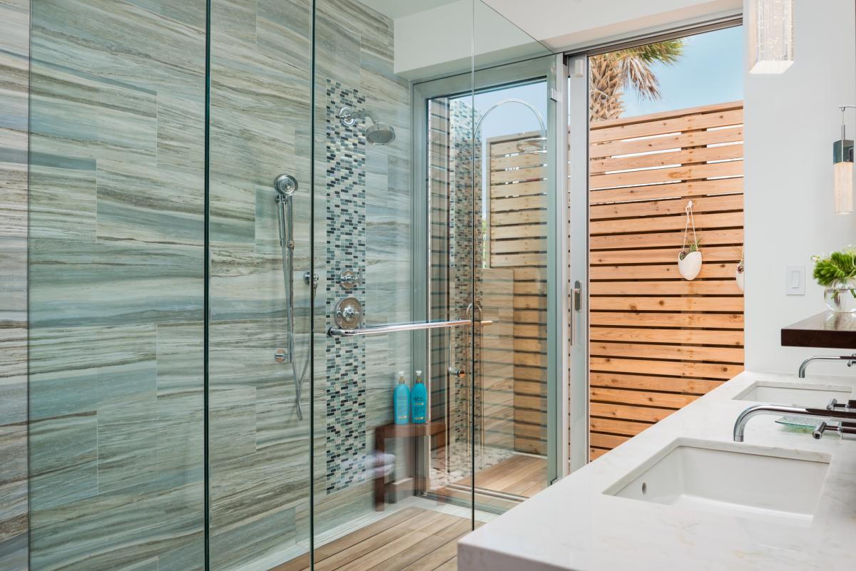 Primary Bedroom: The room has a king-sized bed, a TV, and air conditioning. There is an ensuite bathroom and an outdoor shower. The room also has a patio/balcony, an ocean view, and can be entered internally or externally.