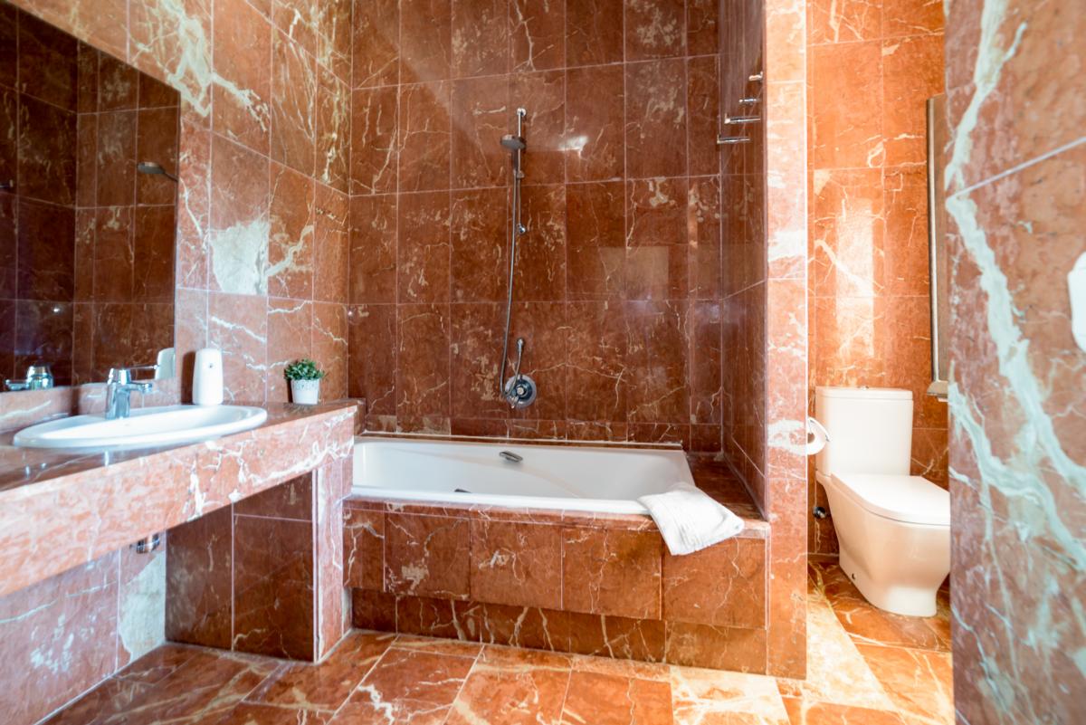 All bedrooms have elegant en-suite bathrooms with tubs, rain showers and bidets. The bathrooms feature beautiful marble tiling on the walls and floors and slabs of solid marble for the vanities.