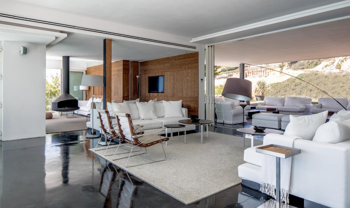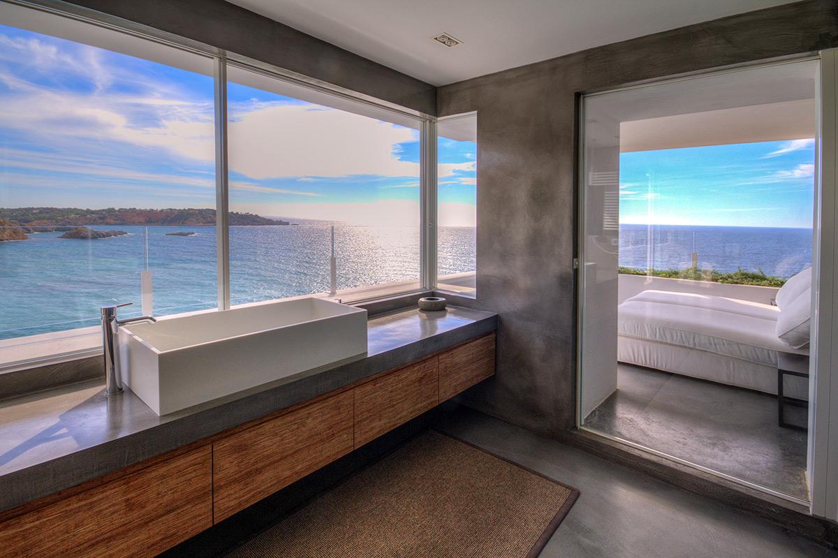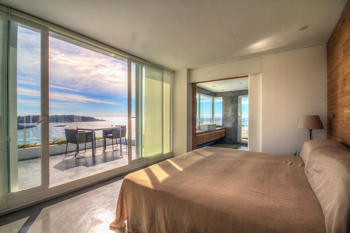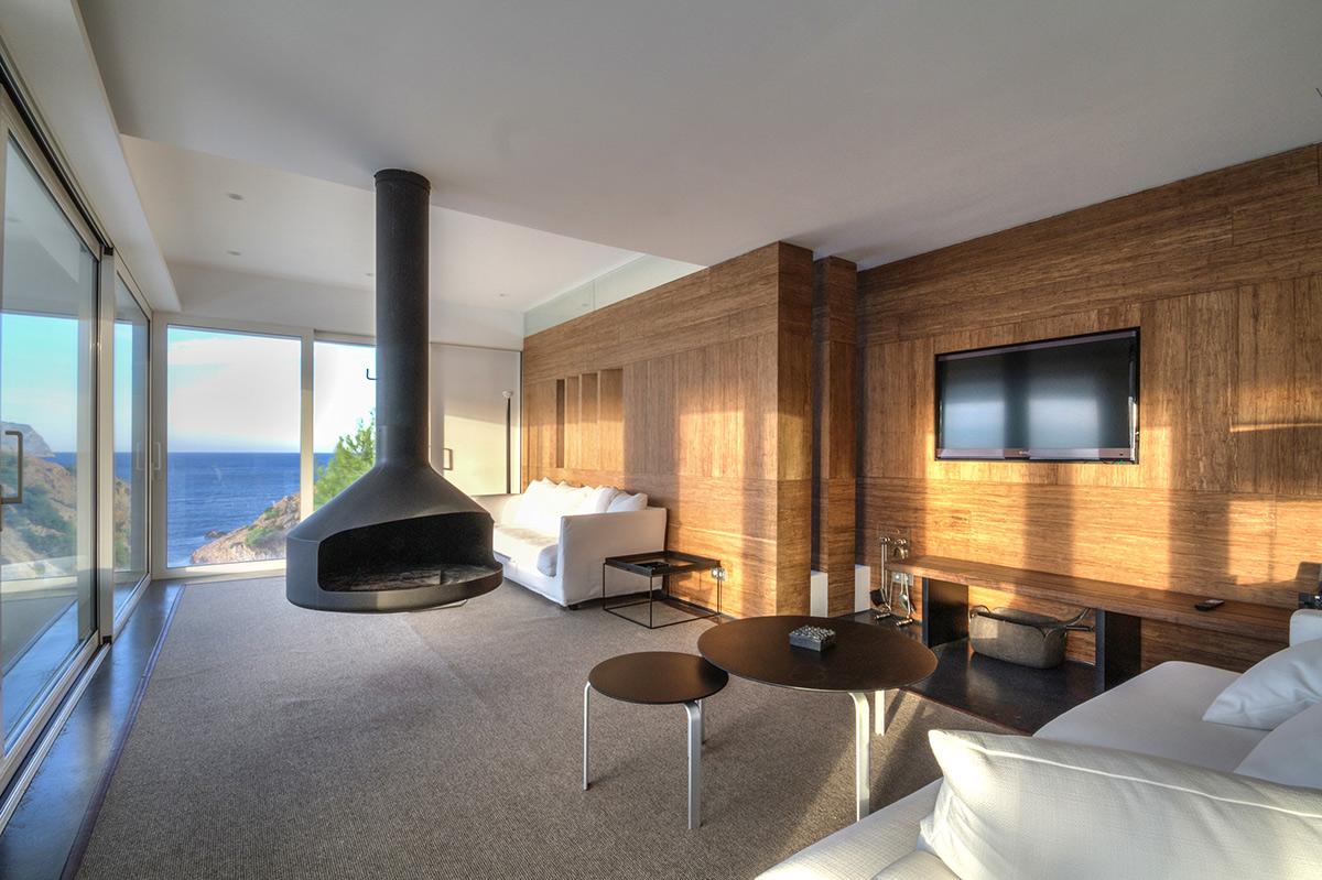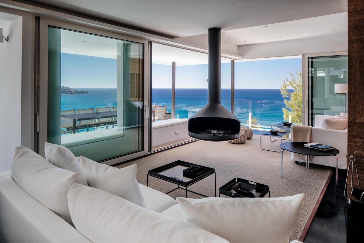 Equipped with WiFi as well as a state of the art sound system throughout, the home is at the height of technology as well as modernity which is present in the home’s finishes and furnishings. The home’s common areas are each occupied by furniture designed with clean lines and supple white fabrics, accompanied by surprising design elements, such as fireplaces suspended from the ceiling as well as industrial cement and natural wood finishes. The living room is comfortably furnished and the kitchen is equipped with top of the line appliances and utensils. The dining area boasts plenty of seating for guests – sea views abound from each common area and offer inspiration around every turn.