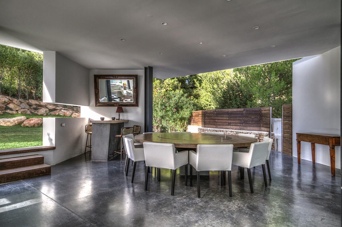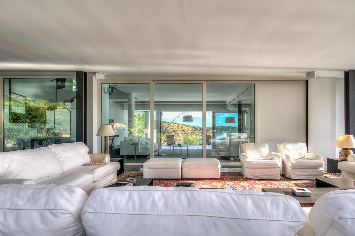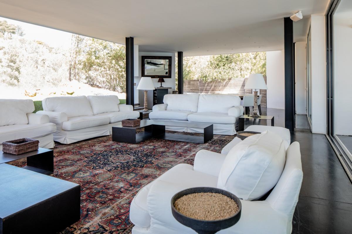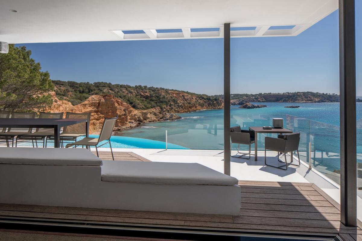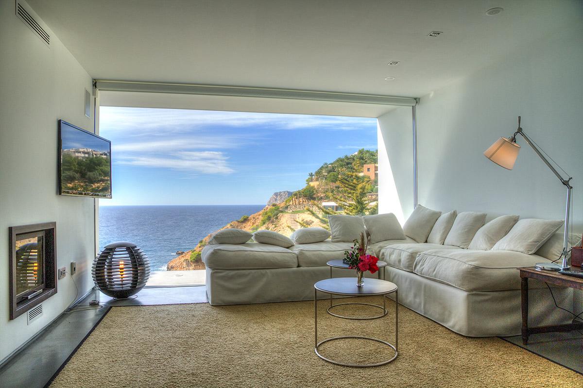 Equipped with WiFi as well as a state of the art sound system throughout, the home is at the height of technology as well as modernity which is present in the home’s finishes and furnishings. The home’s common areas are each occupied by furniture designed with clean lines and supple white fabrics, accompanied by surprising design elements, such as fireplaces suspended from the ceiling as well as industrial cement and natural wood finishes. The living room is comfortably furnished and the kitchen is equipped with top of the line appliances and utensils. The dining area boasts plenty of seating for guests – sea views abound from each common area and offer inspiration around every turn.