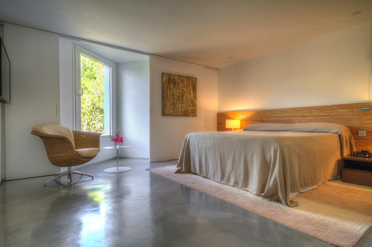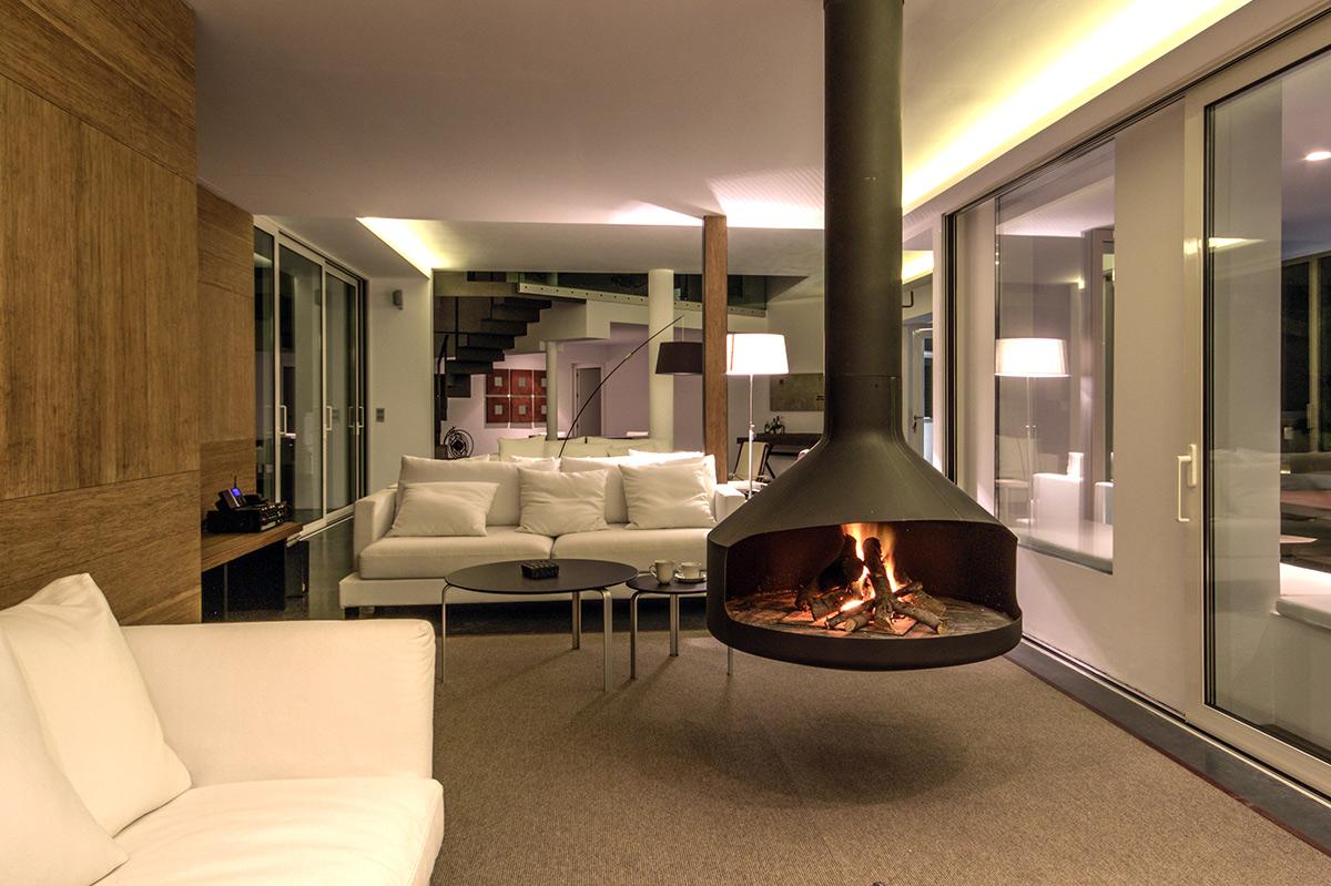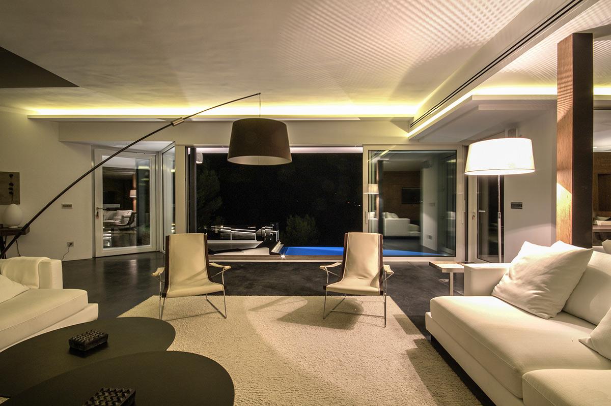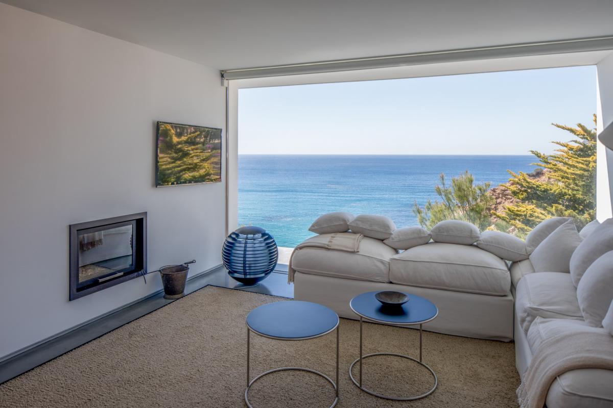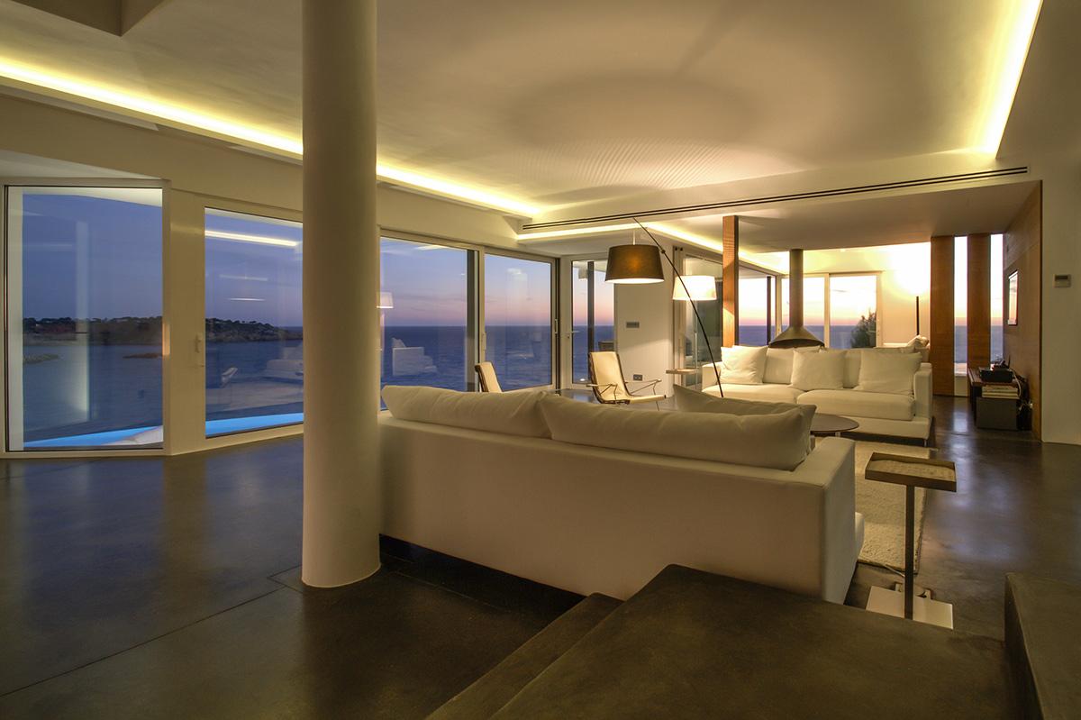 Equipped with WiFi as well as a state of the art sound system throughout, the home is at the height of technology as well as modernity which is present in the home’s finishes and furnishings. The home’s common areas are each occupied by furniture designed with clean lines and supple white fabrics, accompanied by surprising design elements, such as fireplaces suspended from the ceiling as well as industrial cement and natural wood finishes. The living room is comfortably furnished and the kitchen is equipped with top of the line appliances and utensils. The dining area boasts plenty of seating for guests – sea views abound from each common area and offer inspiration around every turn.