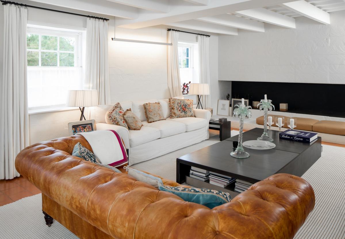 Upon arriving at the property on the winding drive, guests cross a spacious patio and greeting area to the home’s main entry through a large foyer with painted white wood beam detailed ceilings leading way to the arched entries of both the formal dining room and living areas. The living area off to the left is occupied by two sofas which mirror one another and enjoy a large fireplace in between. Opposite this sitting area is a TV room with double chaise lounge, flat screen TV and bookcases lining the walls. The neighboring dining room has seating for up to eighteen guests and is flooded with natural light through the series of arched windows running parallel to the table. Serving this dining space is the kitchen with ample counter space, farmhouse sink and breakfast table for up to eight. Completing this level is a full laundry room and powder room.