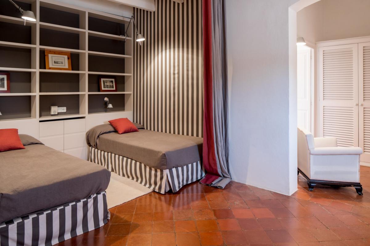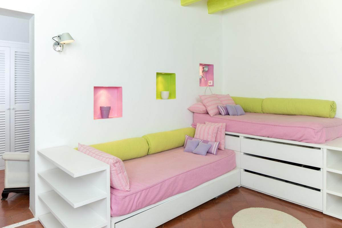 Up the staircase, located just off the home’s foyer, guests will find the master suite with king size bed and en suite bathroom with full shower and deep soaking tub. A small office joins the room to a large terrace, adorned with comfortable sofas and breathtaking views. Two additional guest bedrooms may also enjoy this space, each with two twin size beds and their own en suite bathrooms with shower/tub combinations.