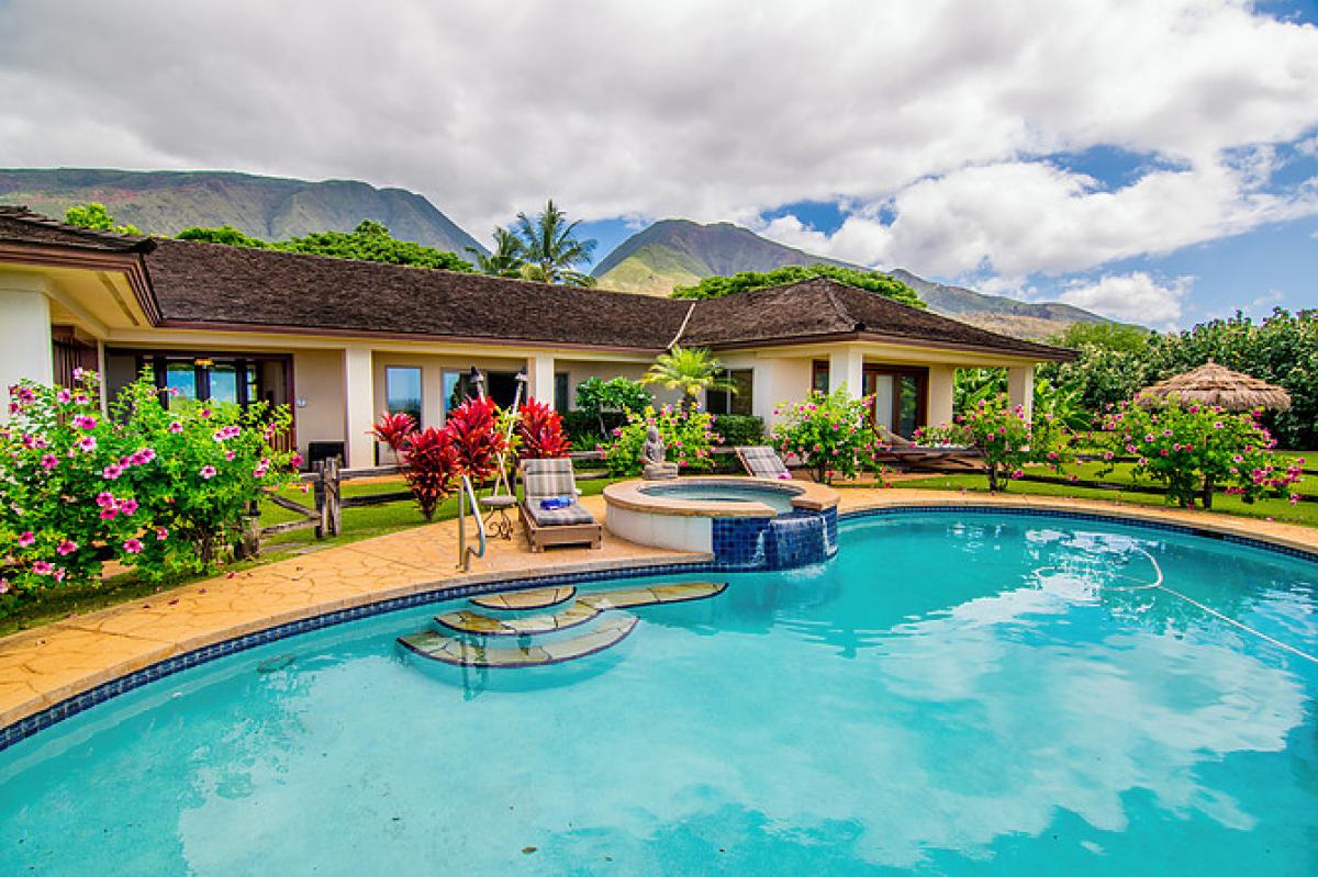 Nestled at the foot of the West Maui mountains, with views of the islands of Moloka’i and Lana’i, spacious Makena Aloha Estate can host 10 guests comfortably within its 3 bedroom main house and 2 bedroom cottage. The main house has 3 spacious bedrooms, each with en suite full bathrooms. There is an extra room adjacent to the master bedroom, perfect for a small child. The master bedroom retreat has a separate entrance and a spacious bathroom with a large open walk-in shower, rain showerhead, hand held device, jacuzzi tub, and double vanity sinks. The custom gourmet kitchen is complete with reverse osmosis system, Vita Mix machine, espresso maker and double ovens. Relax around the outdoor pool and jacuzzi spa at the main house. Pool heating is available for an additional charge.
