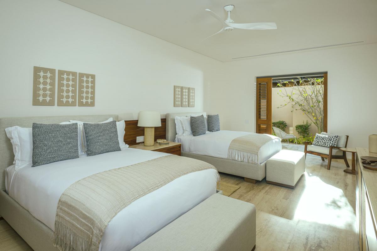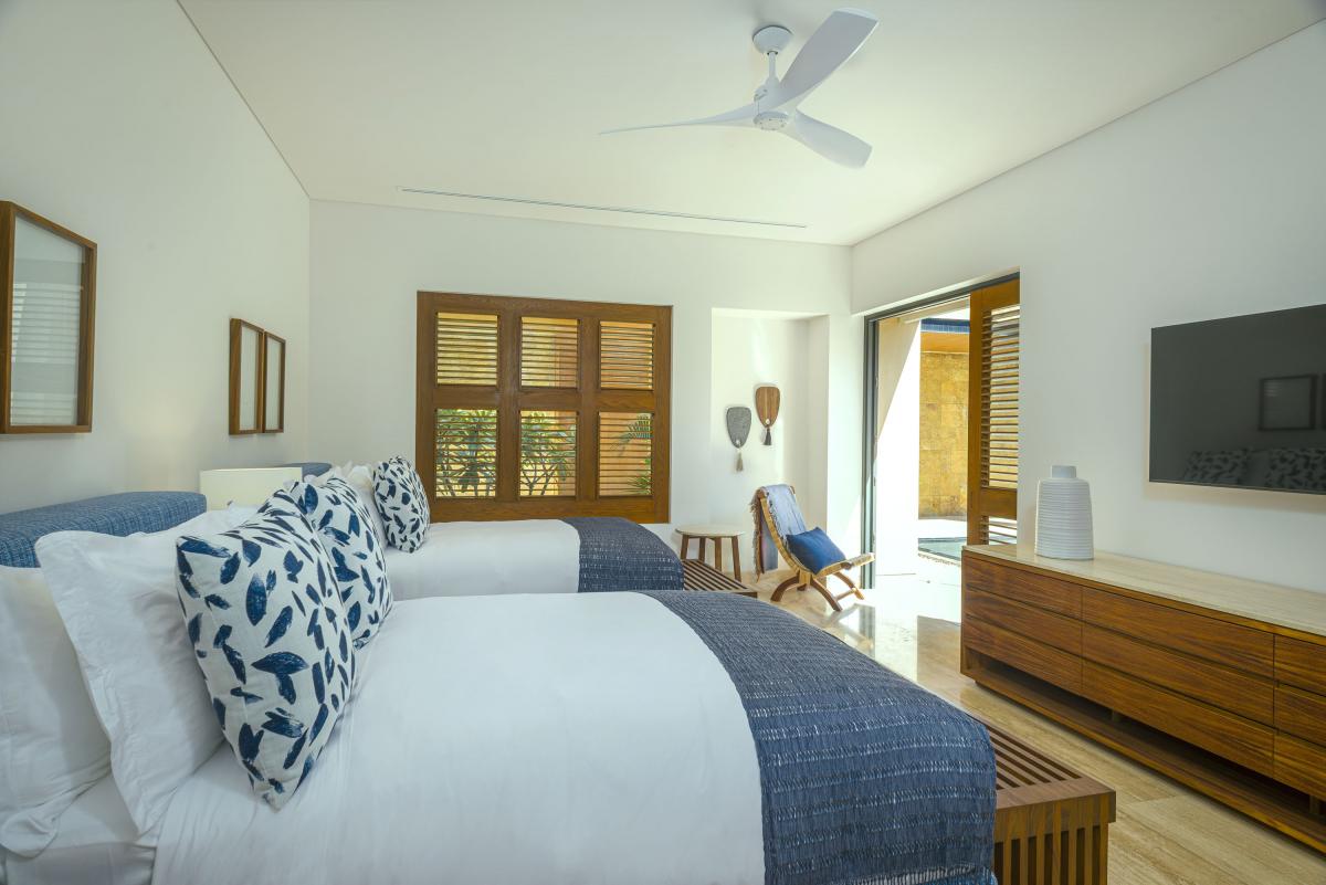 Bedroom 3: Two Queen beds, full bathroom, smart TV, private terrace, ceiling fan, blackout curtains, AC